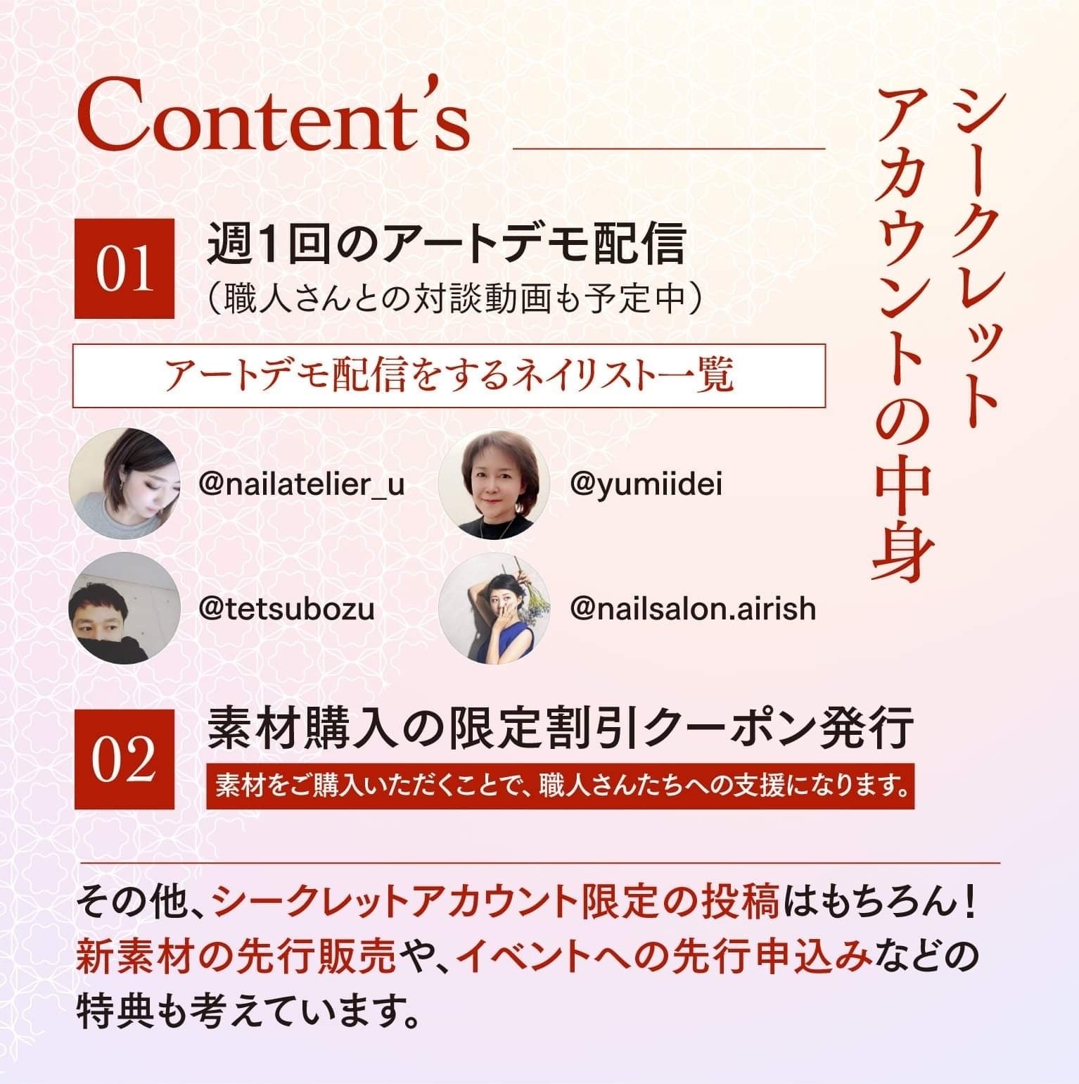 新たに開設する伝統工芸ネイルネットショップにて販売される職人さんたちの手作りの伝統工芸ネイルの新素材の先行販売やお得な情報を先行配信する他、イベントへの先行申し込みなどの特典も考えています!