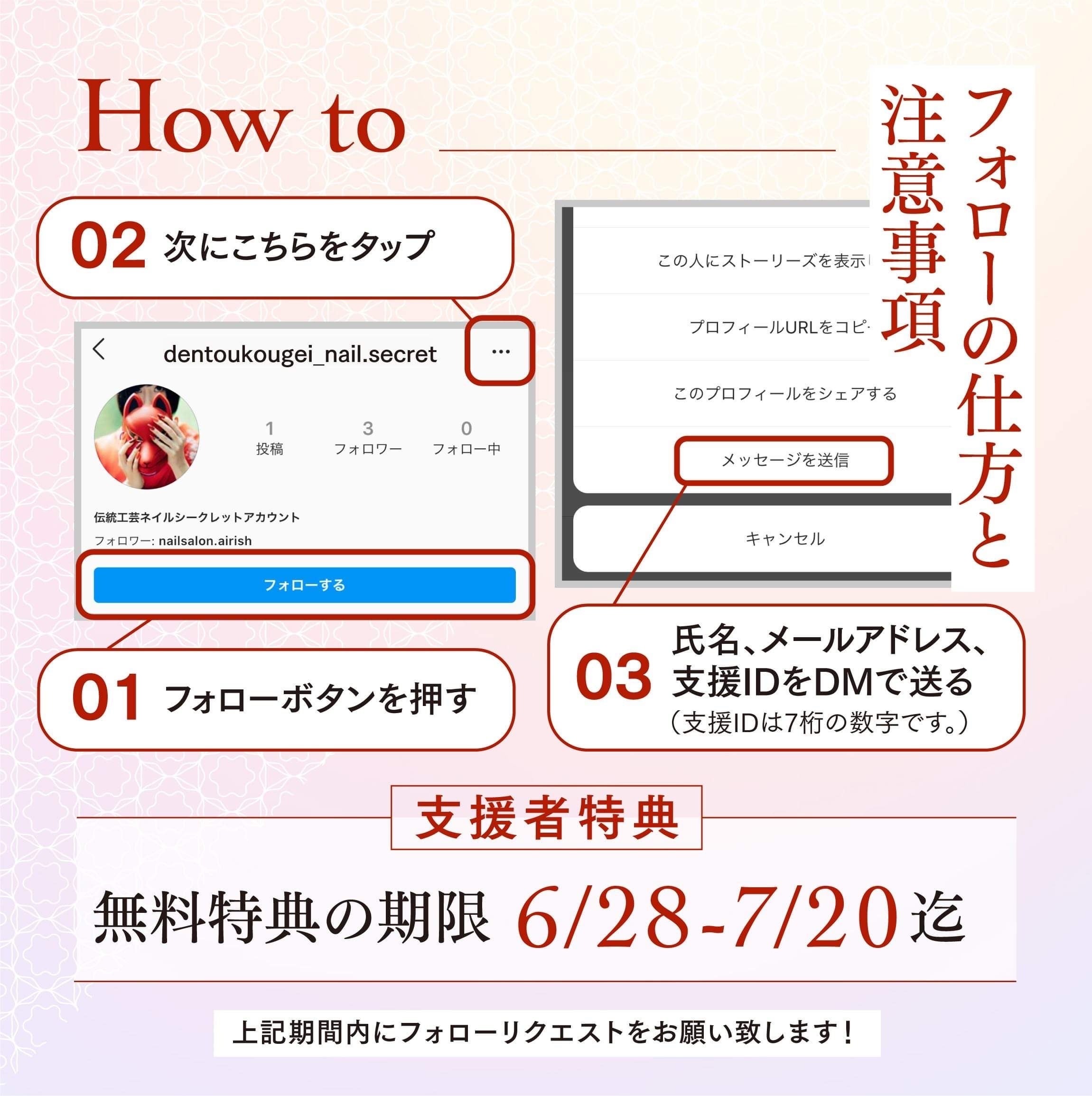 ⑶【氏名】【メールアドレス】【支援ID(7桁の数字)】をDMにてお送りください!