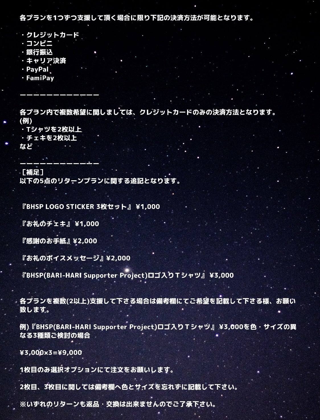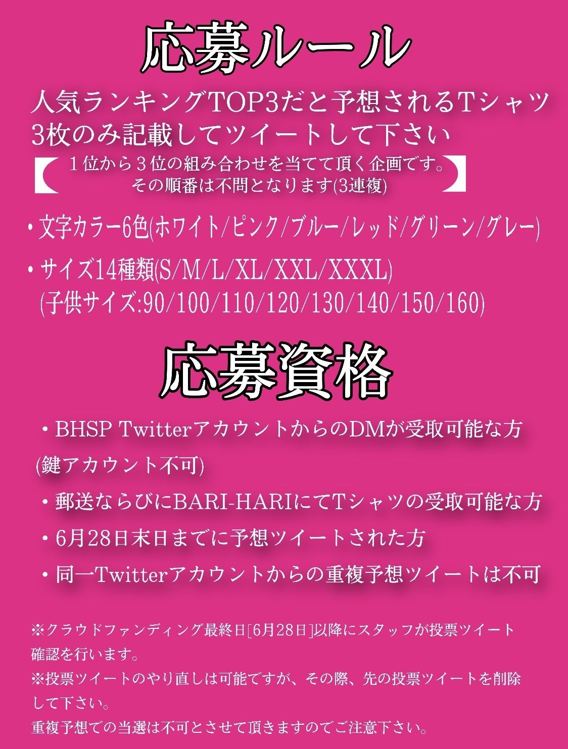 2020/06/08 19:00支援金100万円達成記念企画【TシャツGETチャンス】多くの皆様からのご支援、ご協力、誠に感謝しております。そこで…100万円達成記念企画と致しまして、BHSPクラウドファンディングの人気プランでもありますTシャツをプレゼント企画を致します。人気ランキングTOP3を見事に的中された方にお好みの文字色&サイズを1枚差し上げます。的中数だけイベンターの誰かがBARI-HARIへ3,000円ずつ寄付させて頂きます。#BHSPTシャツGET企画↑Twitterにて、このタグを付けてご参加下さい!※タグ無しは無効となりますのでご注意(中間ランキングは画像参照)BHSPクラウドファンディング最終日(6月28日)〆切 もっと見る