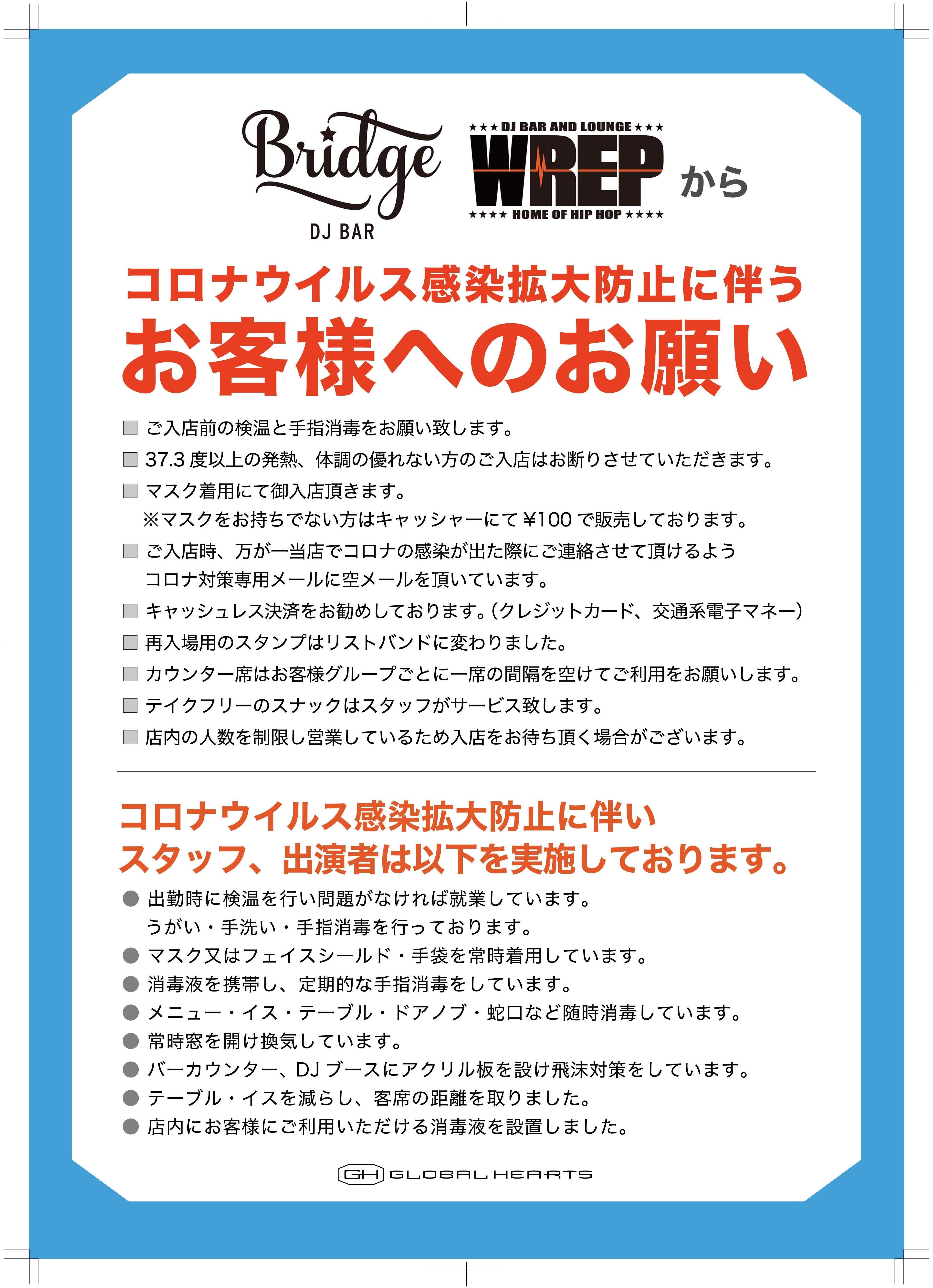 新型コロナウィルス感染の終息が未だに見えない今、お客様にこのようなお願いをすることは本意ではなく大変心苦しいのですが、私たちも何とかDJ BARの草分け的存在であるBridgeをこれからのナイトシーン、ミュージックシーンのためにも存続したくここに至りました事をご理解頂けますと幸いです。
