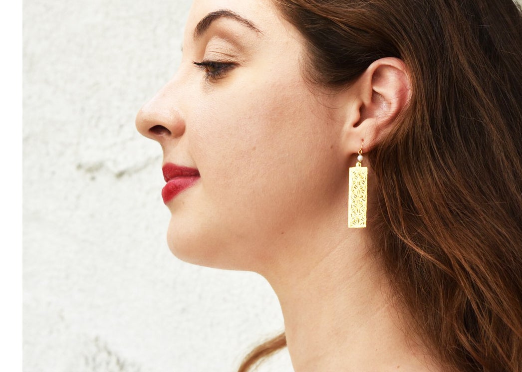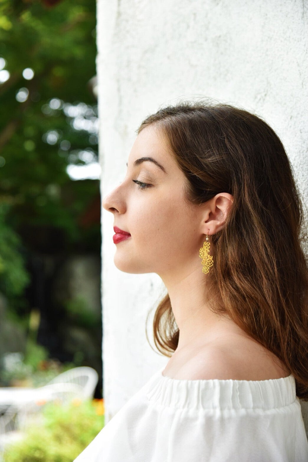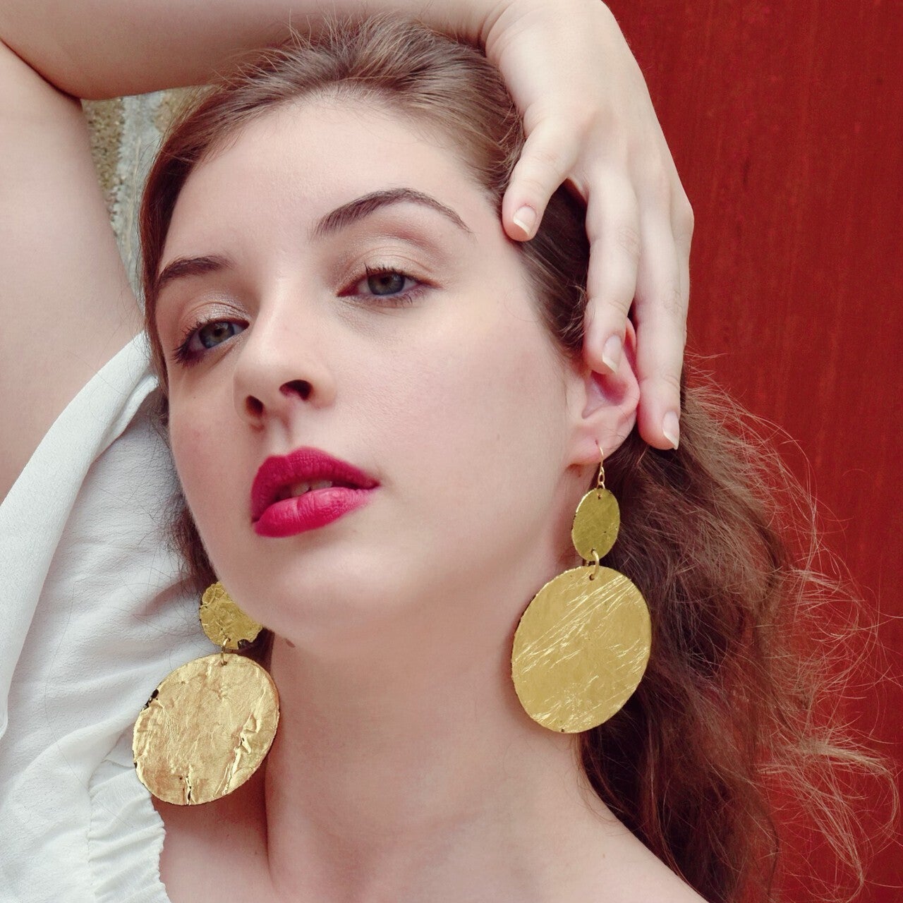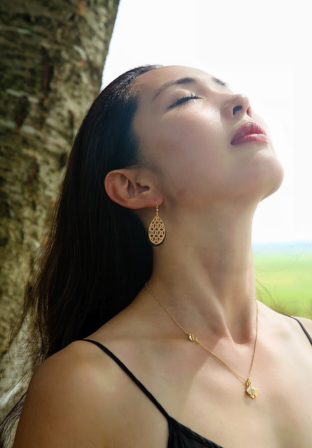 ピアニストKMさん「今まで付けたどんなイヤリングよりも軽くてビックリです!金箔 ならではの温かみがあるため、⻩色人種の肌にも自然に違和感なく馴染んでくれます。つける人の仕草や風に応じて靡く動きのあるイヤリングで、自分に寄り添ってくれている感 じがして愛おしいです。」