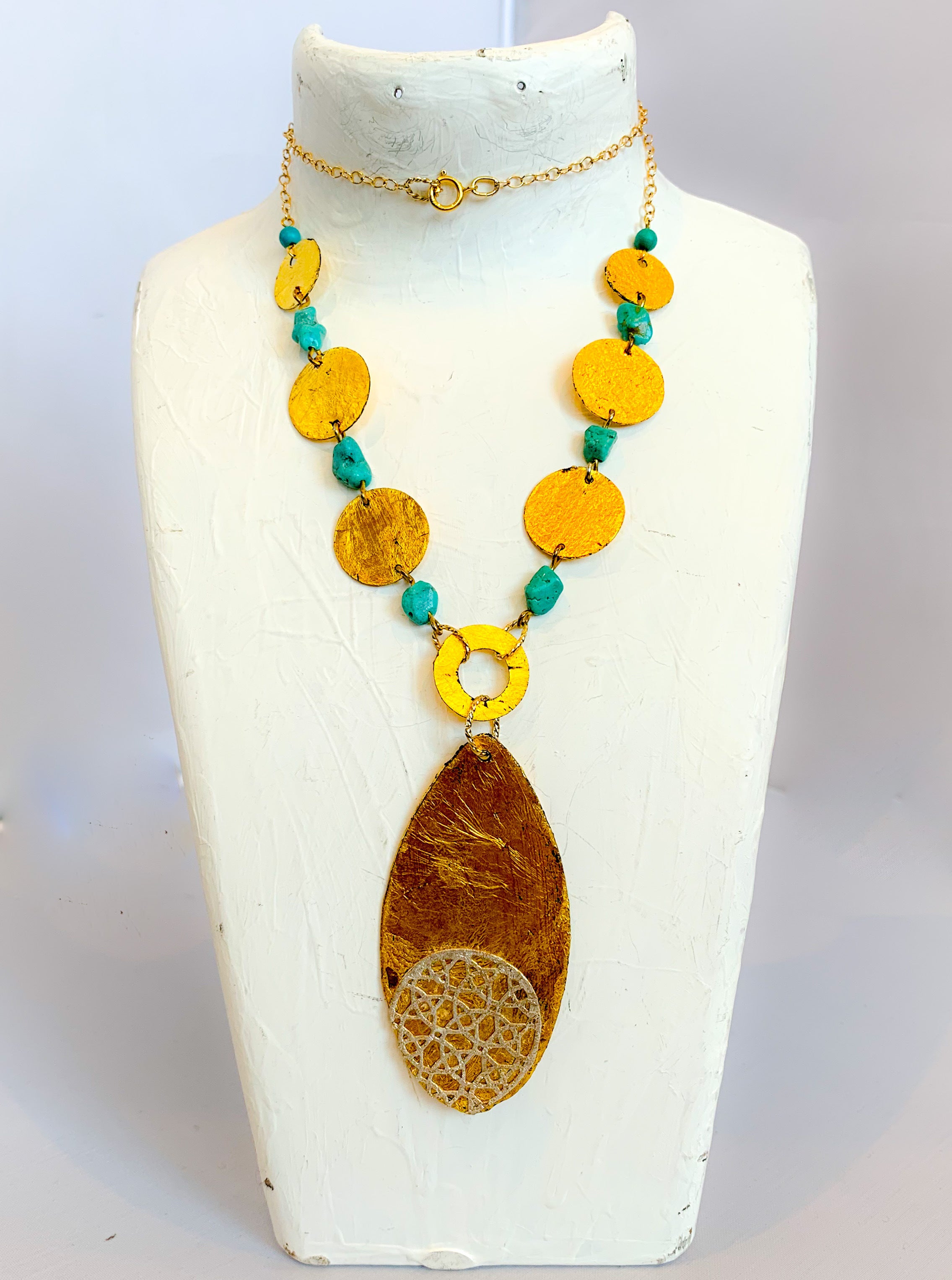 クレオパトラに着けてもらえたら、というイメージで作った1点もののネックレス。純金箔とプラチナ箔で仕上げ、トルコ石で中近東の古代装身具の風合いを出しています。
