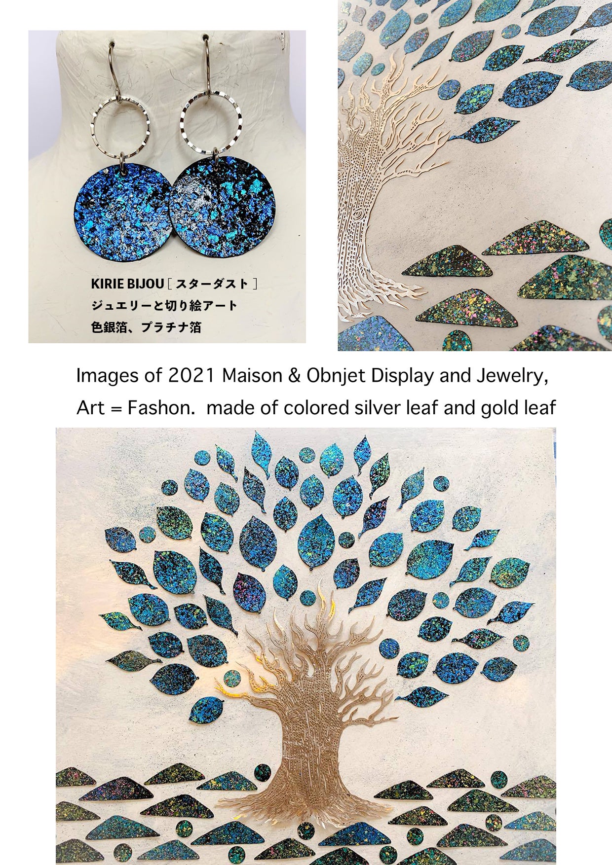 リターン商品、スターダスト・ディープブルー。ジュエリー素材を使った切り絵アートのディスプレイ。色銀箔とプラチナ箔を用いた、スターダストピアス。ディープブルー、ブルー、コバルトブルー、スカイブルーと、4種の青を織り交ぜて、螺鈿のように輝くモルフォ蝶のような美しい青を表現。 (2021年 パリ出展 Maison & Objetブースイメージ資料として、JETRO及びイベント主催事務局に提出。)
