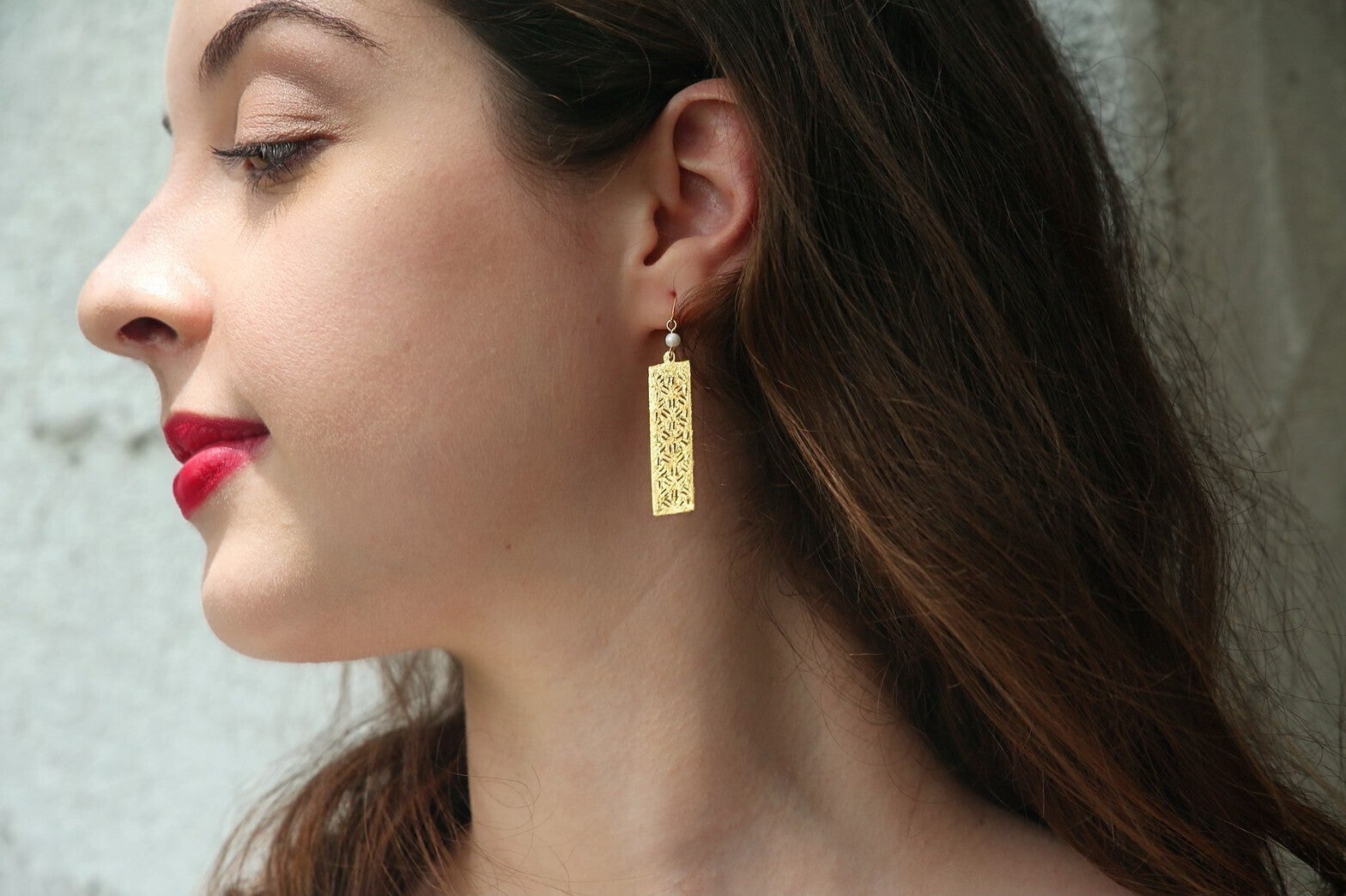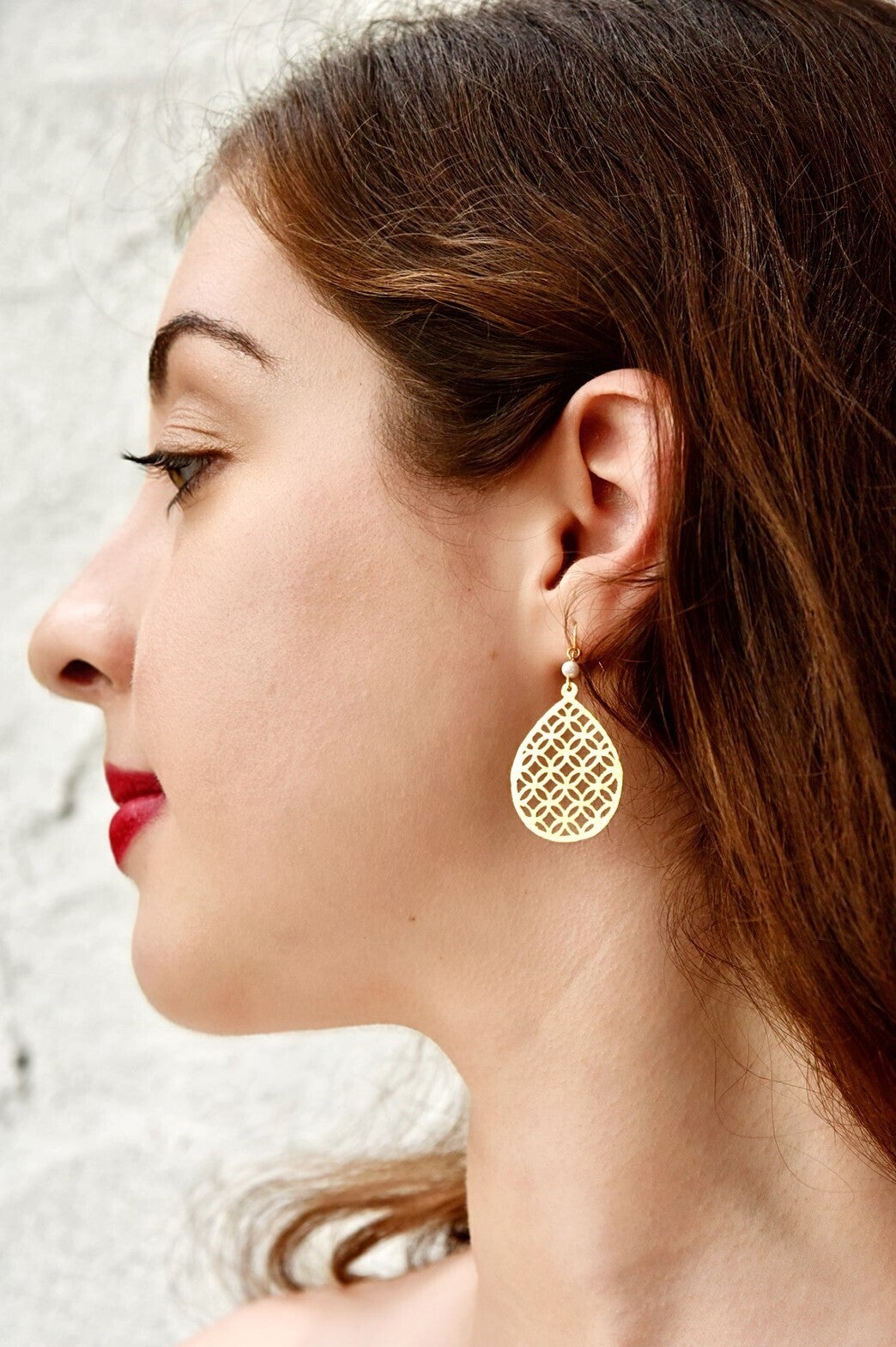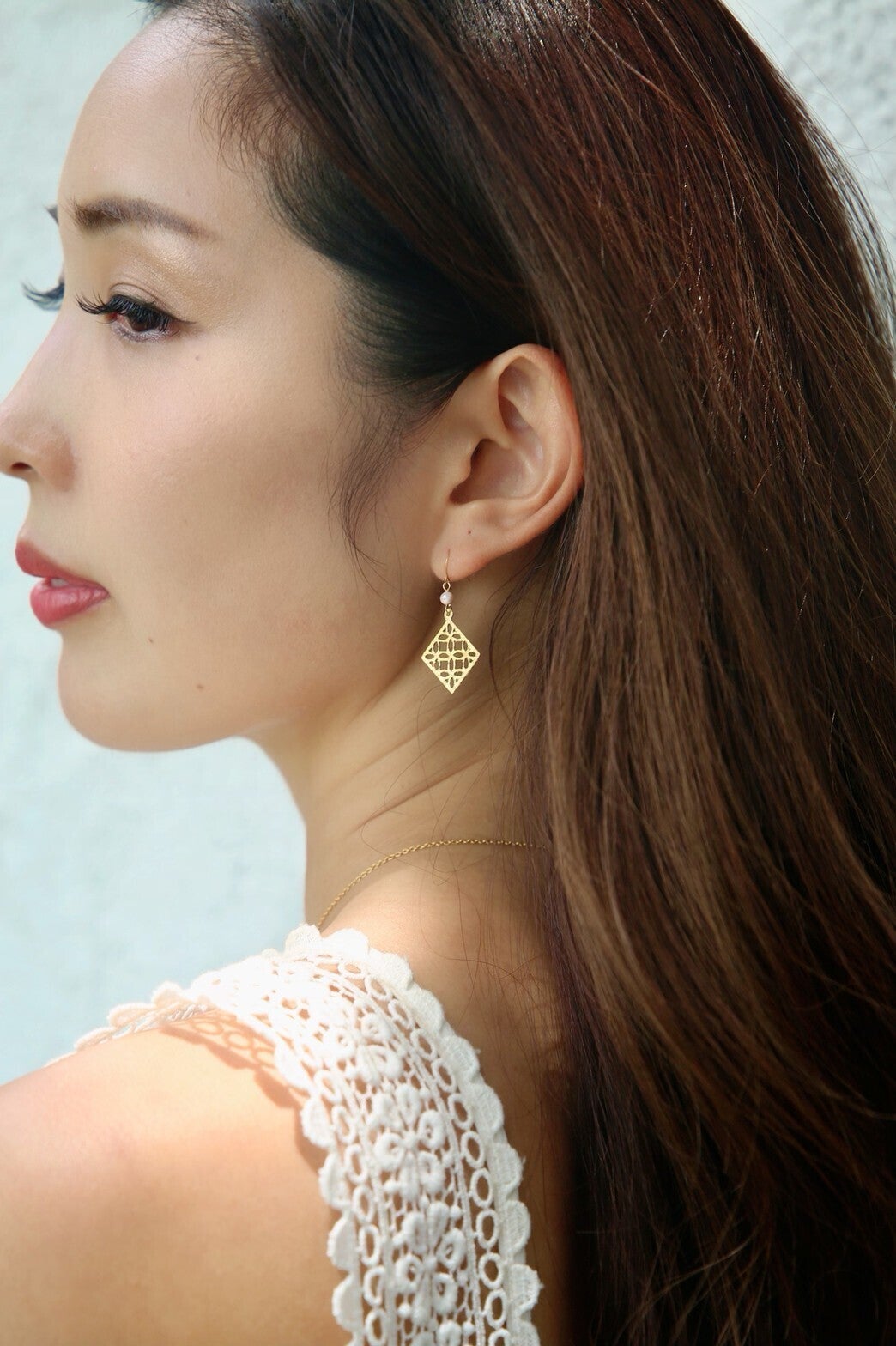 リターン商品 ピアス [ FUWARI ] <古代オリエント> 。今回のジュエリーの中では一番大振りのデザイン。風になびきながらも重厚感溢れ、昨今の大振りなトレンドジュエリーをたのしむ方におすすめ。カジュアルにもあいますが、ぜひ、シンプルなドレスに合わせていただけたらと思う一品です。