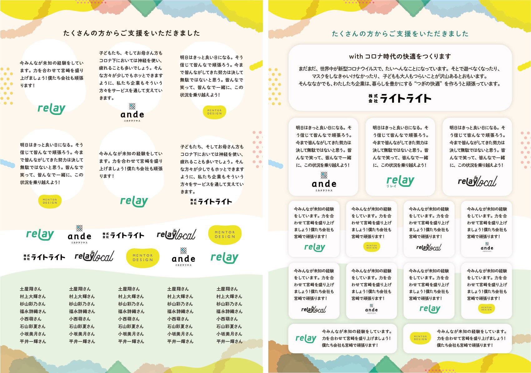 ただロゴを掲載するだけでなく、今回ご協力頂いた皆さまから一言添えていただけるようなスペースをご用意しました。お話するみなさまから、子どもたちや親御さん向けに激励の言葉を頂きます。ぜひその気持ちを絵本上でメッセージにして頂けますと幸いです。