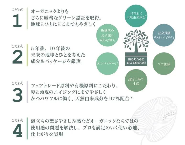 いま世界のメディアが注目する“クリーン・ビューティ”ムーヴメントを牽引するエルゴンは、厳しい国際グリーン認証「Mother Science」を取得した最先端のオーガニックヘアケア製品を生産しています。