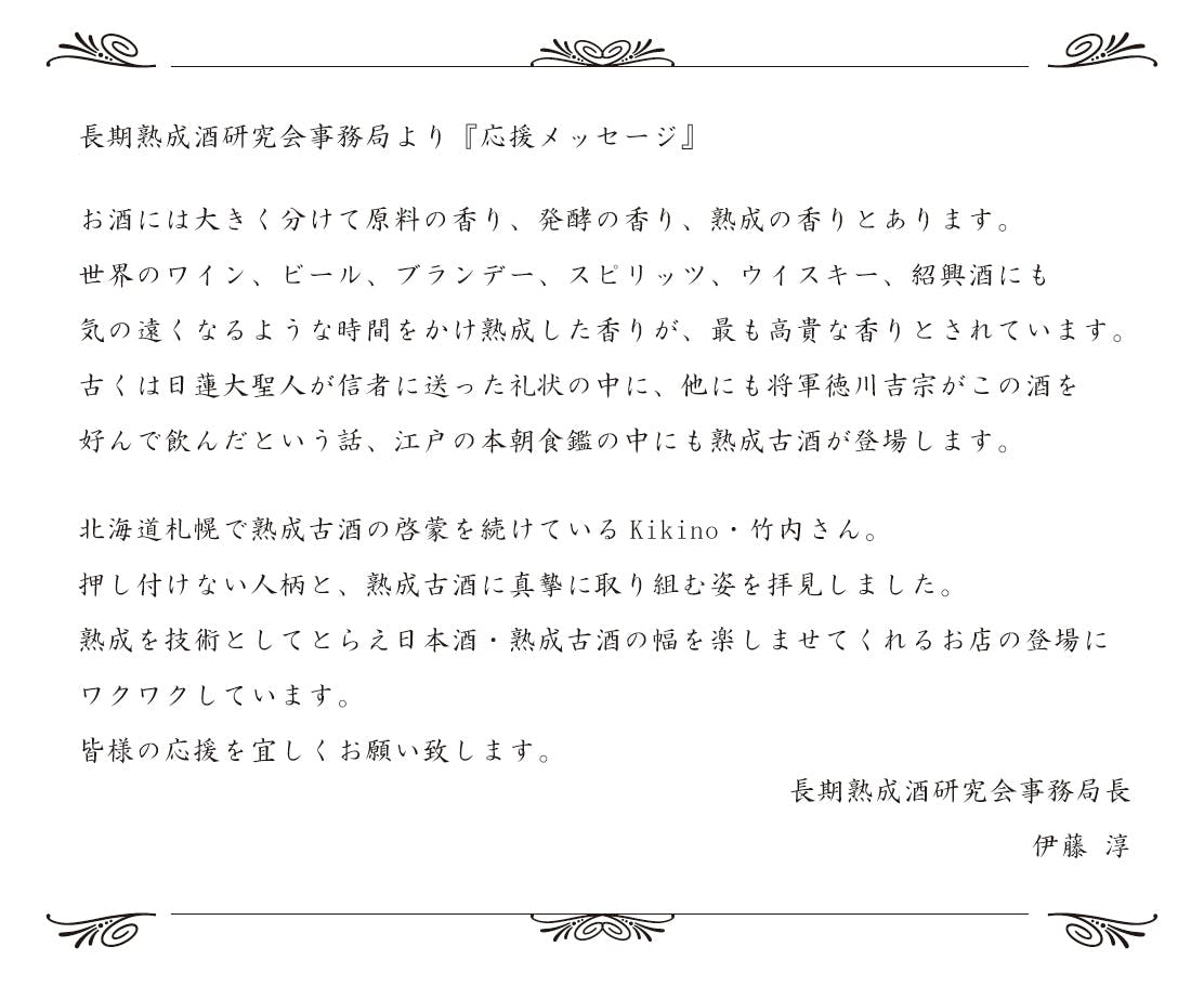 昨日、長期熟成酒研究会より応援メッセージをいただきましたのでご紹介させていただきます。