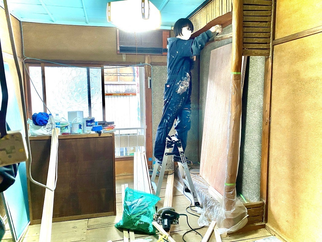 元々あった畳を外して板張りにしたり、電気配線などの作業は大工さん達にお願いします。