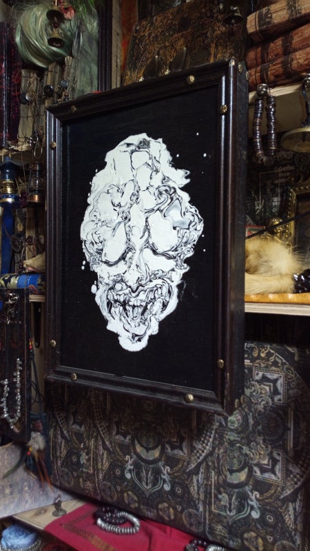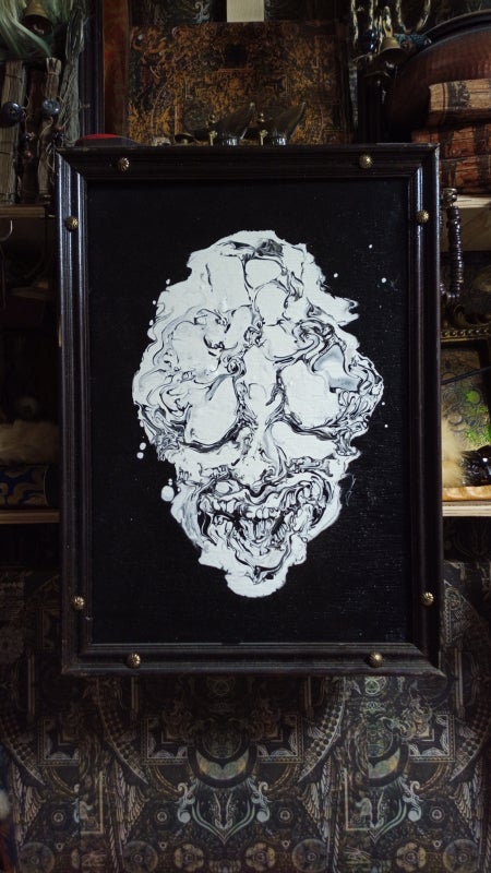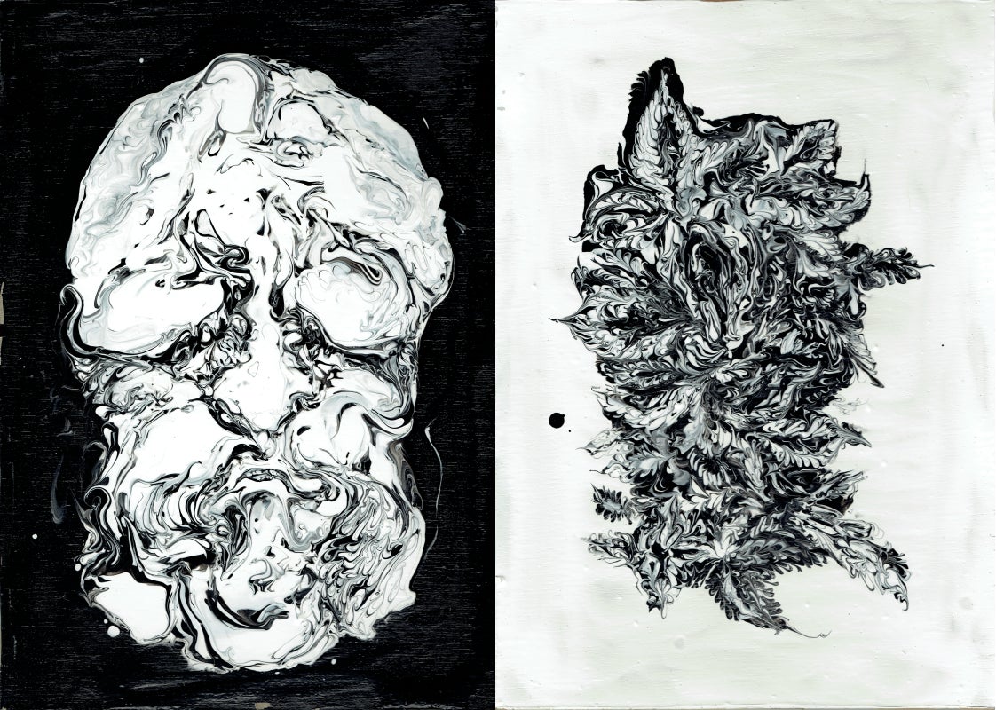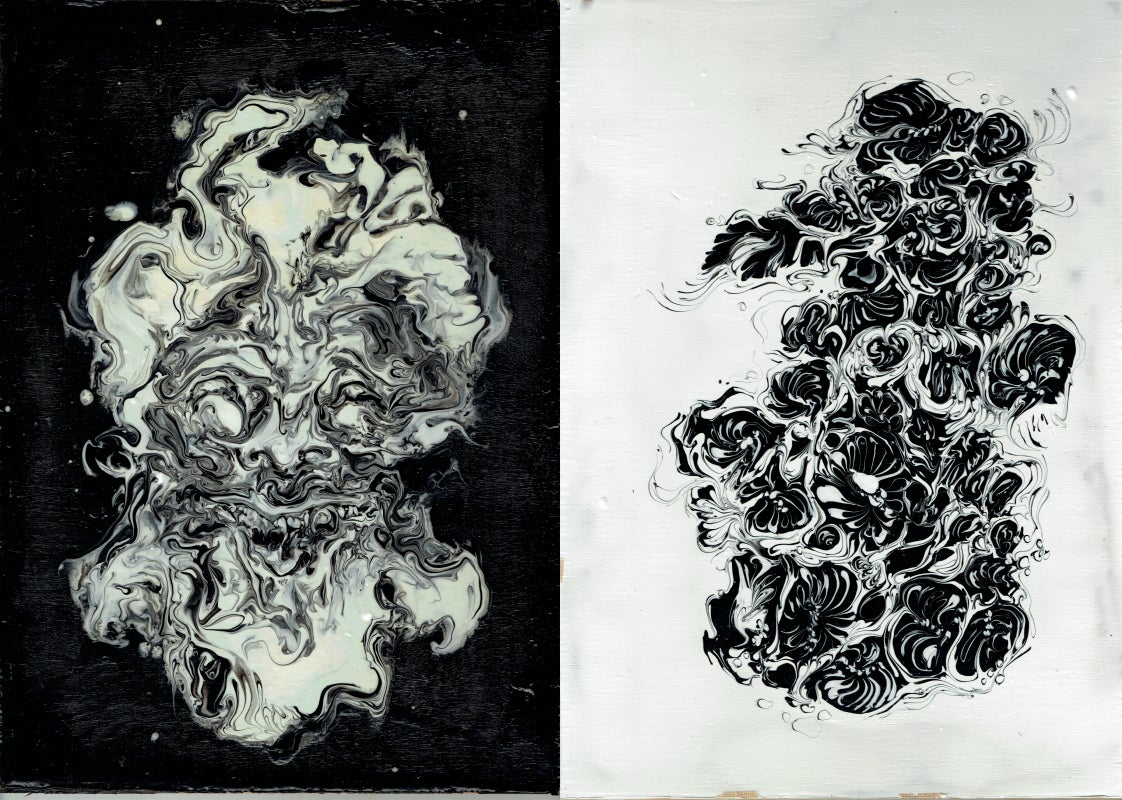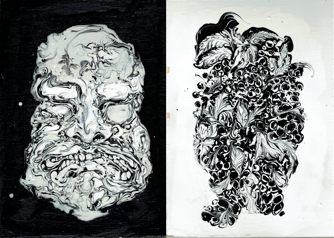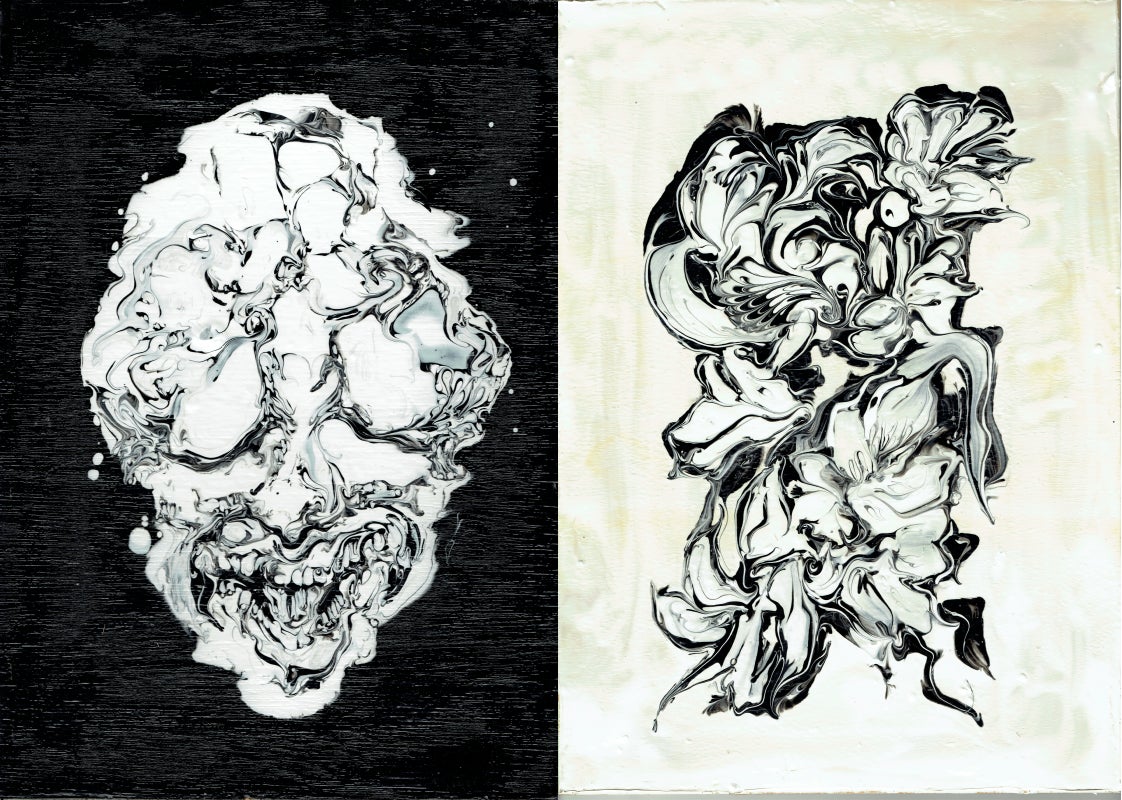 白黒のマーブリング・ドリッピング・コラージュなどの技法を用いた独特の絵画を制作。