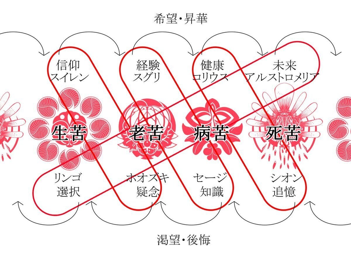 苦しみ、というとネガティブなイメージを持ちますが、ポジティブな意味も含ませたいと考え、一つの苦に対して二種類の花言葉を与えました。