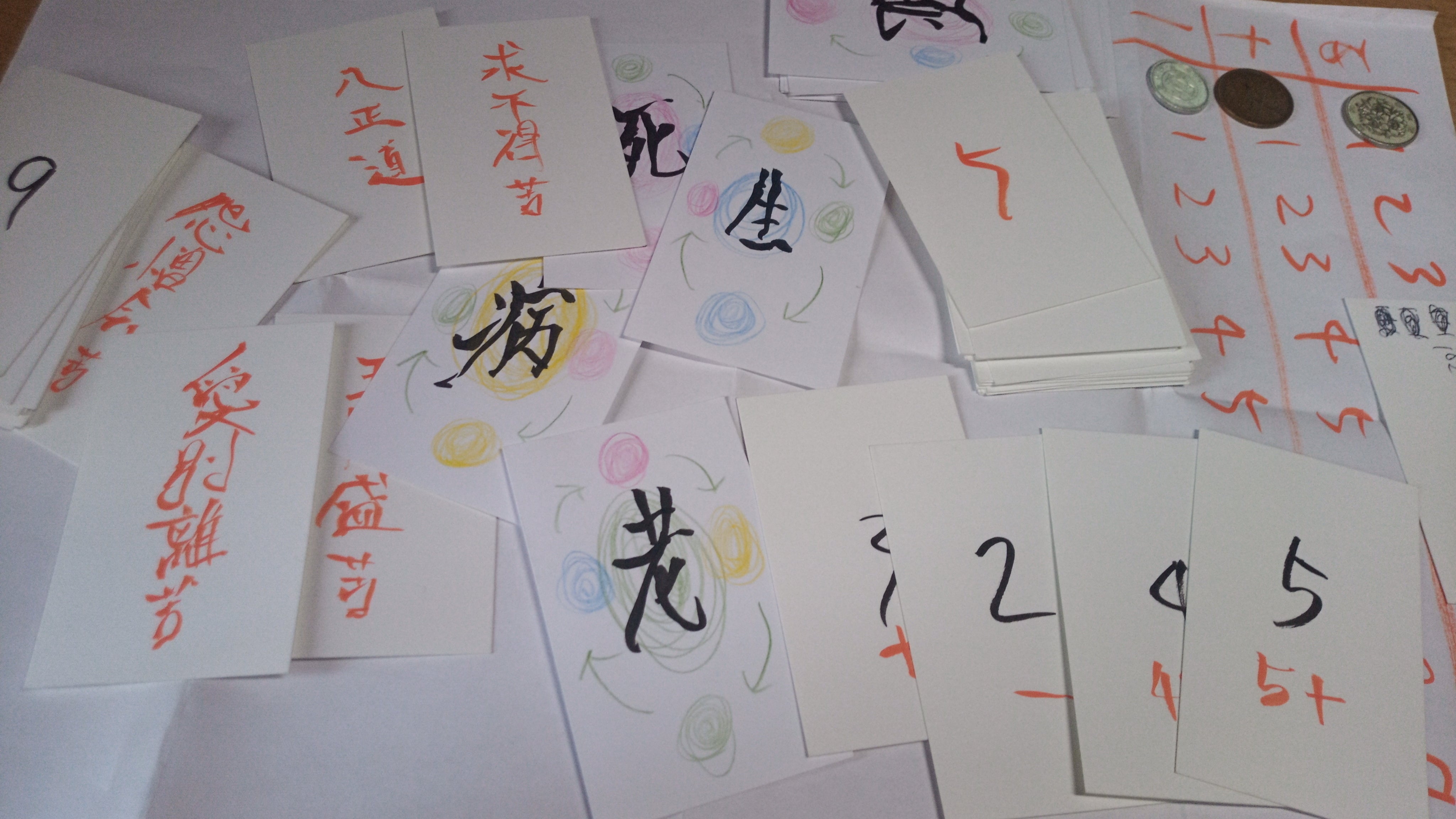 札は四苦八苦と八正道の9種のみで、五行のようにそれぞれが影響し合う効果を持ち、相手が伏せて置いた札を予想して自身も同じ札を出すことで進行するものでした。