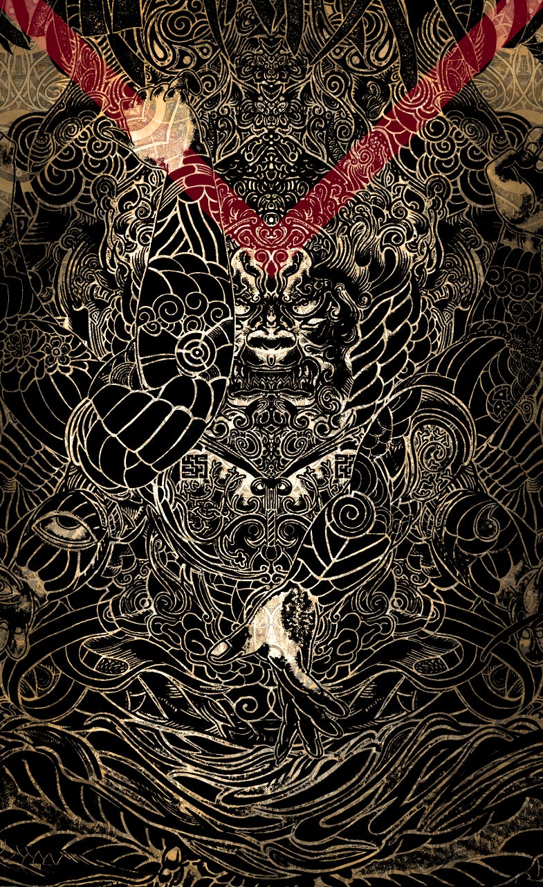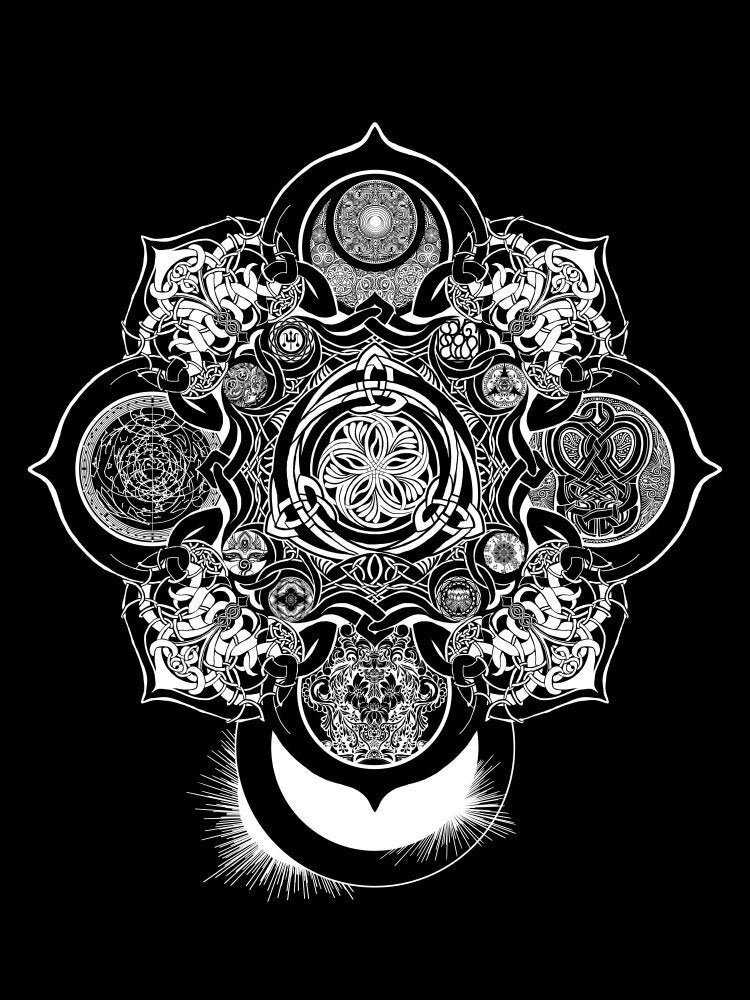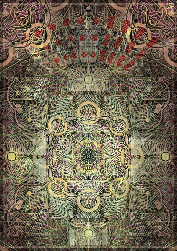 曼荼羅は基本的な様式がいくつかあります。建築を俯瞰視したもの、生態系を図案化したものなど様々ですが、いくつかの特徴的なシルエットを踏襲しながら糸が層になって絡み合うような図を描きました。