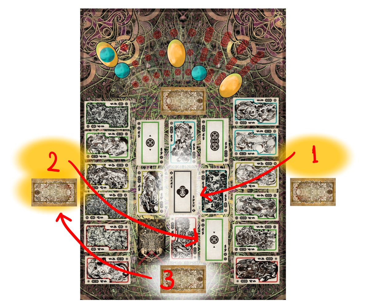 決定したルールでは苦の相関関係は無くなっていますが、場に札を重ねることで数を近づける、苦しみを理解し寄り添う、という効果でイメージを残しています。