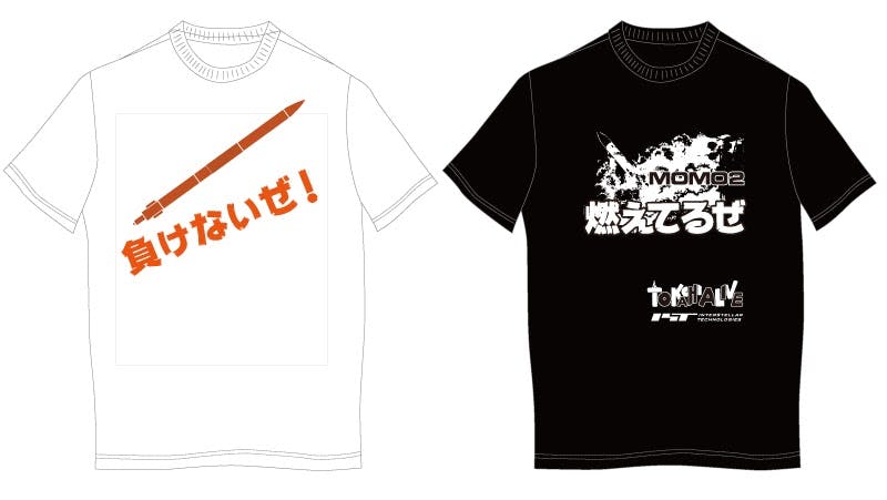 また、今回特別にMOMO2号機打上げ失敗直後に開催されたTOKACHI ALIVE会場で販売された「燃えてるぜ!」Tシャツを再生産してリターンとさせていただきます。どちらかをお選びください。