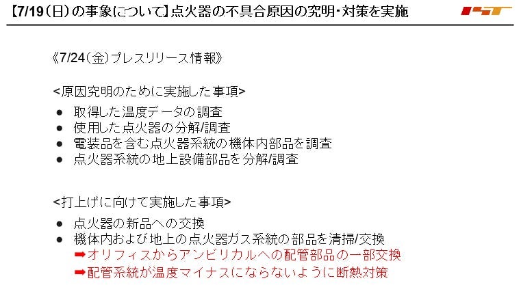 先週19日に打上げを実施した際に、自動停止の原因となった点火器の着火の遅れについて、想定される原因と今回の打上げまでに行った対策についてご報告いたします。