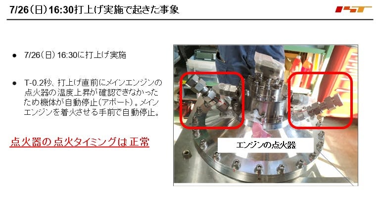 打上げ予定時刻(T-0秒)の時点で、2つある点火器内に設置された温度センサーの測定値が、両方とも基準値を超えていること(点火器に着火し、メインエンジン着火に必要な量の火炎がでている状態)が打上げの条件となりますが、19日の事象では1つの点火器の点火が遅く、時間内に規定の温度に達しなかったことから、ロケット機体のコンピュータが自動停止いたしました。(自動停止のことをアボートといいます)