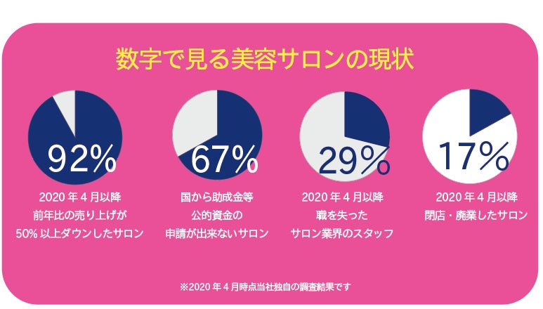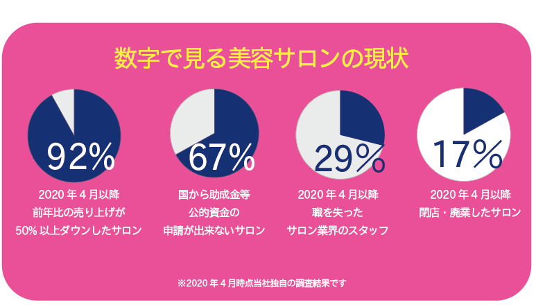 新型コロナウィルスの影響で売上が激減していることは想像に難くないですが、それ以上に既に新型コロナの影響で閉店をしたサロンや職を失った人が既に数多くおり、このままでは増え続ける一方だと考えています。また、条件を満たせずに国からの支援などを受けることができないサロンが3件に2件は存在している計算になります。