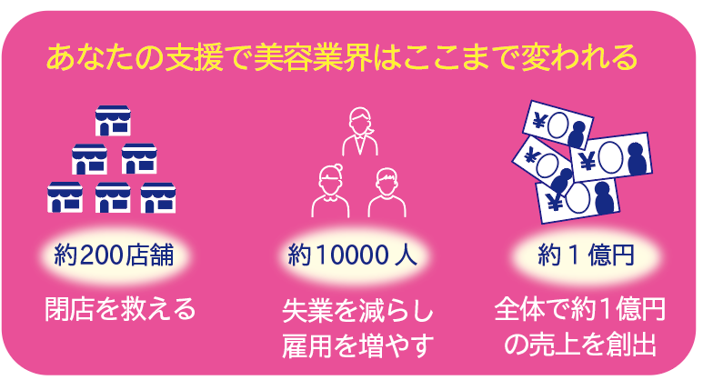 サロン業界を救うプロジェクトに興味のある方が、1人500円~のご支援を頂くと、これだけの雇用機会を創出し、閉店するサロンを救い、業界全体の売上をアップさせることができます。