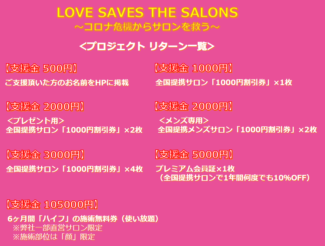 今回は、新型コロナウィルスで苦しむ美容サロンを救いたいという想いで立ち上げるプロジェクト「LOVE SAVES THE SALONS」立ち上げに必要な「WEBシステム構築にかかる制作費用」をご支援頂きたく、掲載致しました。