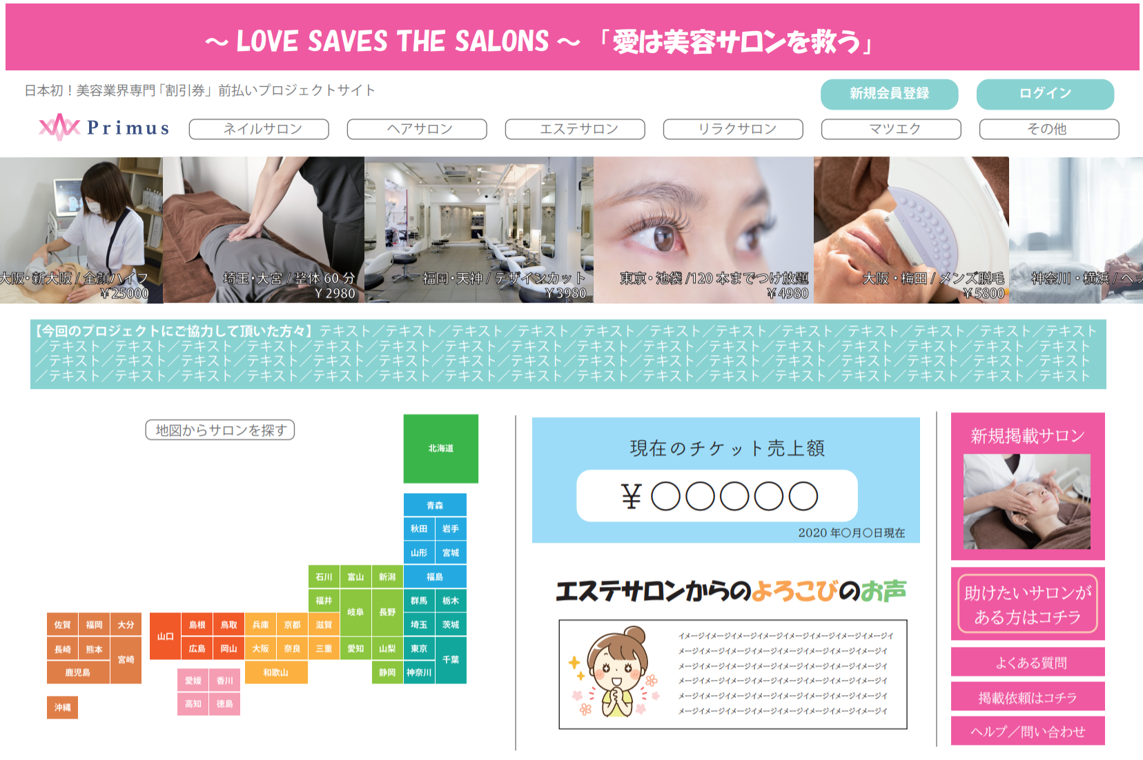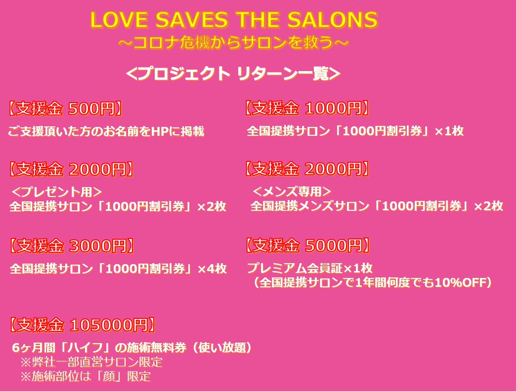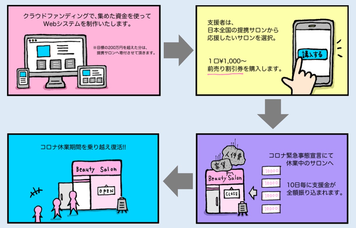 新型コロナウィルスの影響で営業自粛をしており、資金的に苦しい全国の提携美容サロン(2020年4月30日時点で約200店舗の掲載が決定中)を助けるために、日頃インターネットやSNSを見ている方が、サロンが休業しているこの時期に、興味を持って頂いた美容サロンの1枚1000円の「割引券」を先に購入することで、休業中のサロンの家賃や人件費に充ててもらい、何とか閉店せずにお店を残してもらうといったプロジェクトになります。この割引券の売上は、その店舗へ即日全額入金されますので、この苦しい時期の手助けになると考えています。