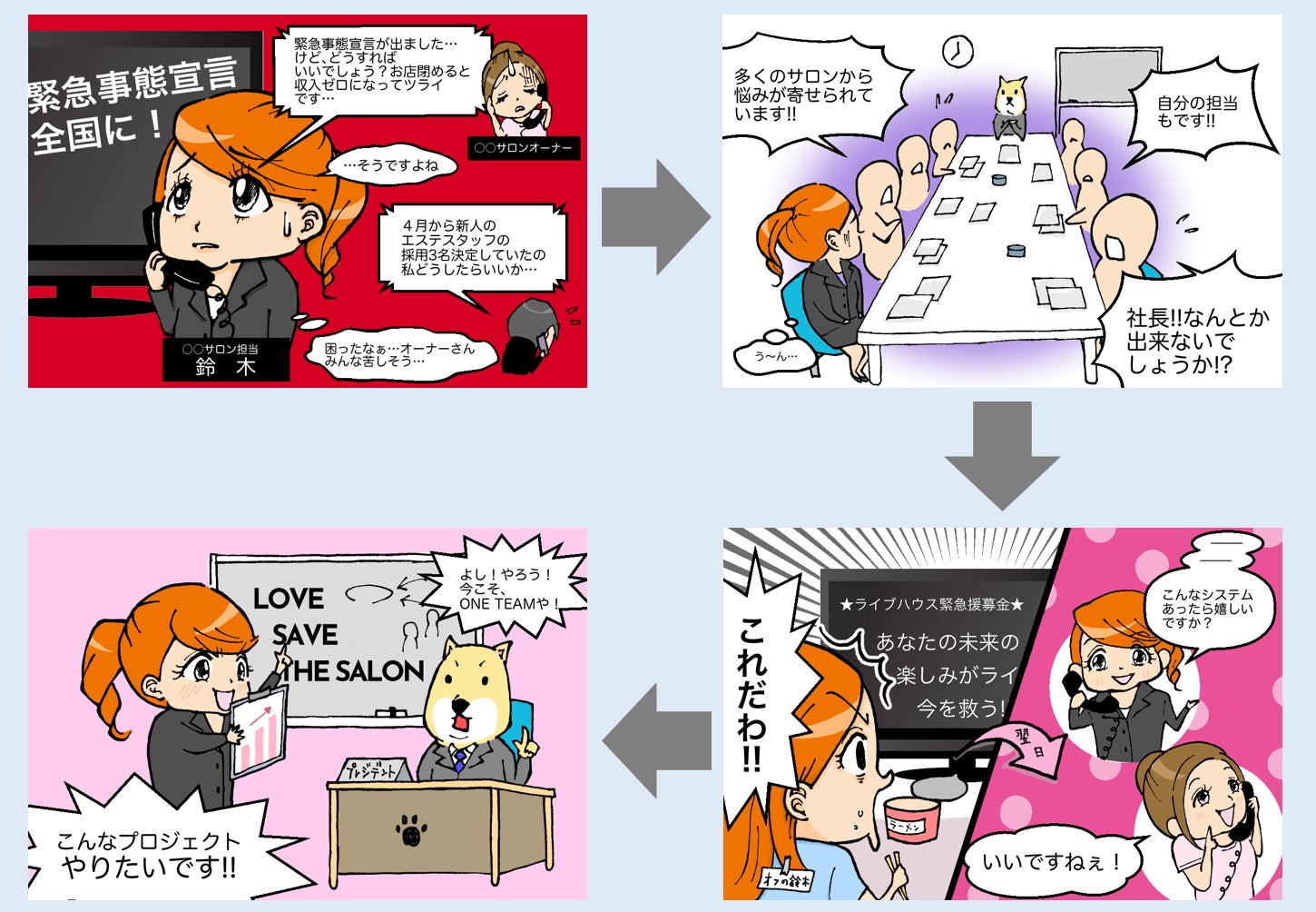 弊社全体としても営業自粛・テレワーク中であり、美容サロン業界を守るため、社員全員一丸となってこのプロジェクトに取り組んでいる最中でございます。