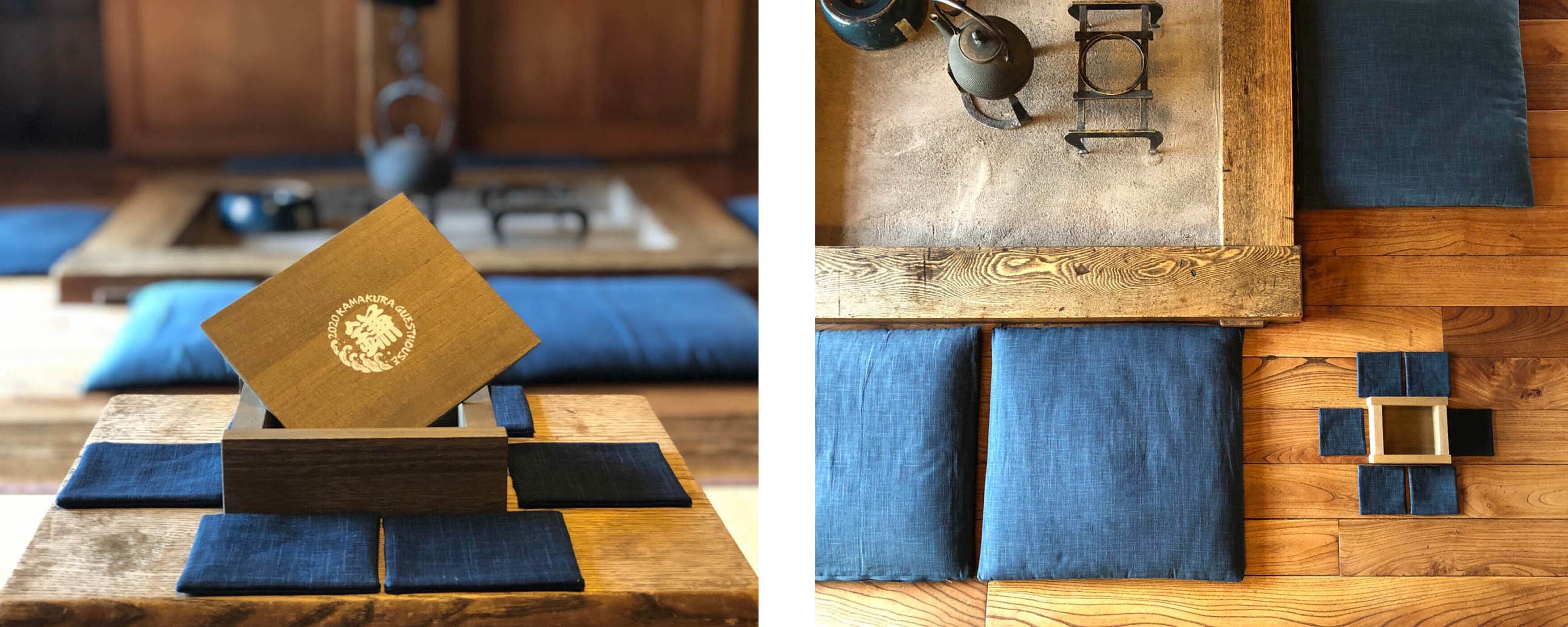 当宿おなじみのわたや森さんの座布団生地を使用した手作りのミニざぶコースターを、北村木箱さん特注の囲炉裏の形をした桐箱に入れてお届けいたします。蓋には2020鎌ゲスの記念ロゴも!