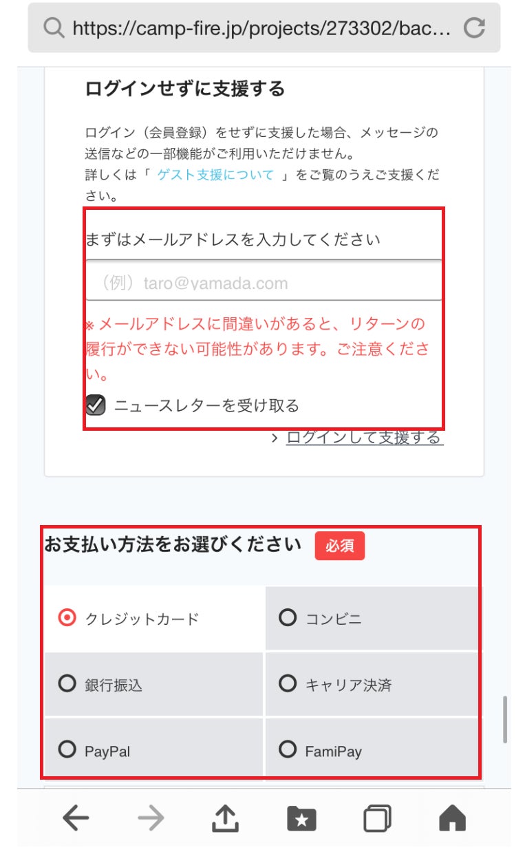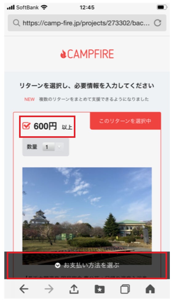 ②支援したいリターンの金額に✔して、お支払い方法を選ぶをクリックします。