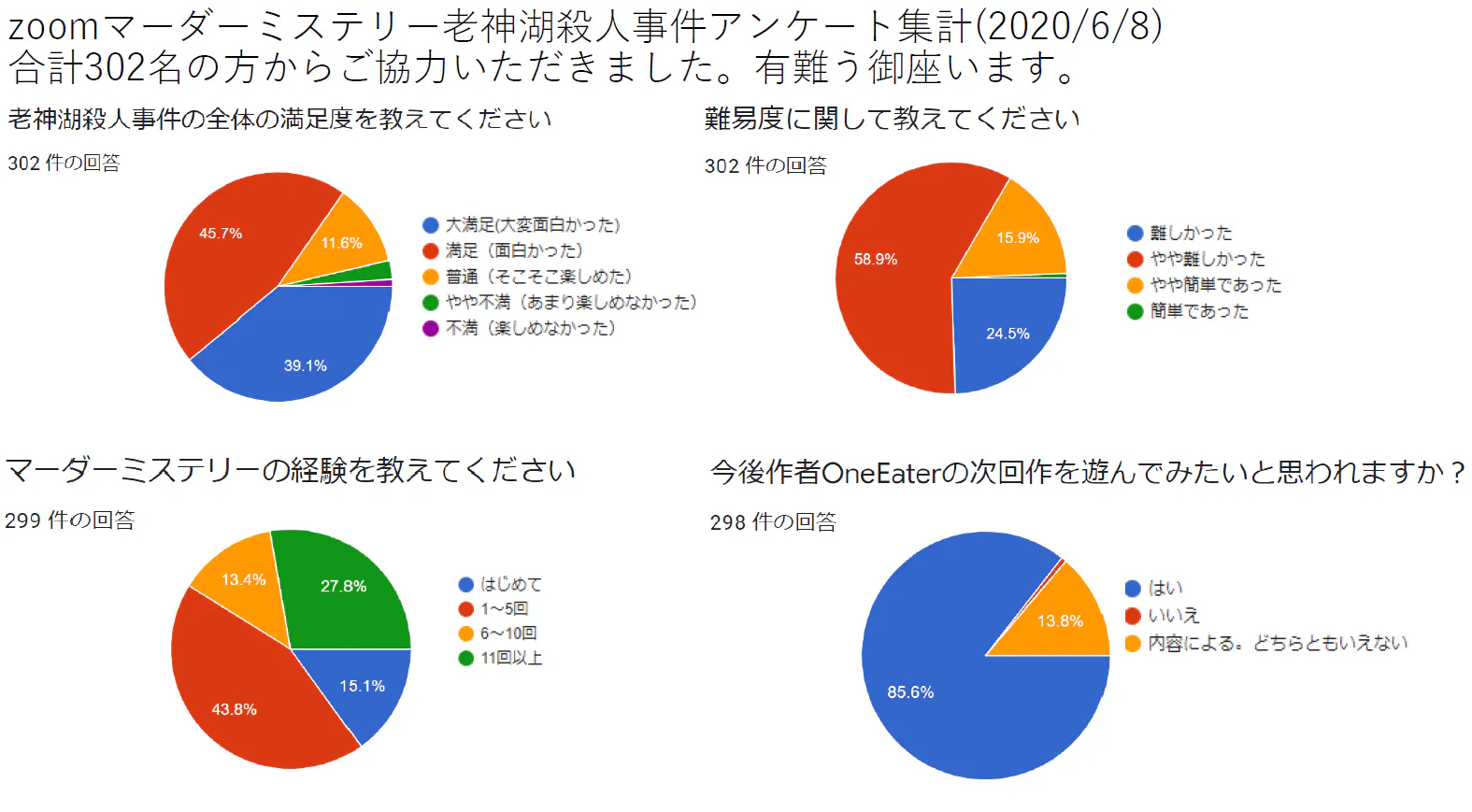 プレイ結果・感想をGoogleアンケートで集計した結果(有効回答302件)
