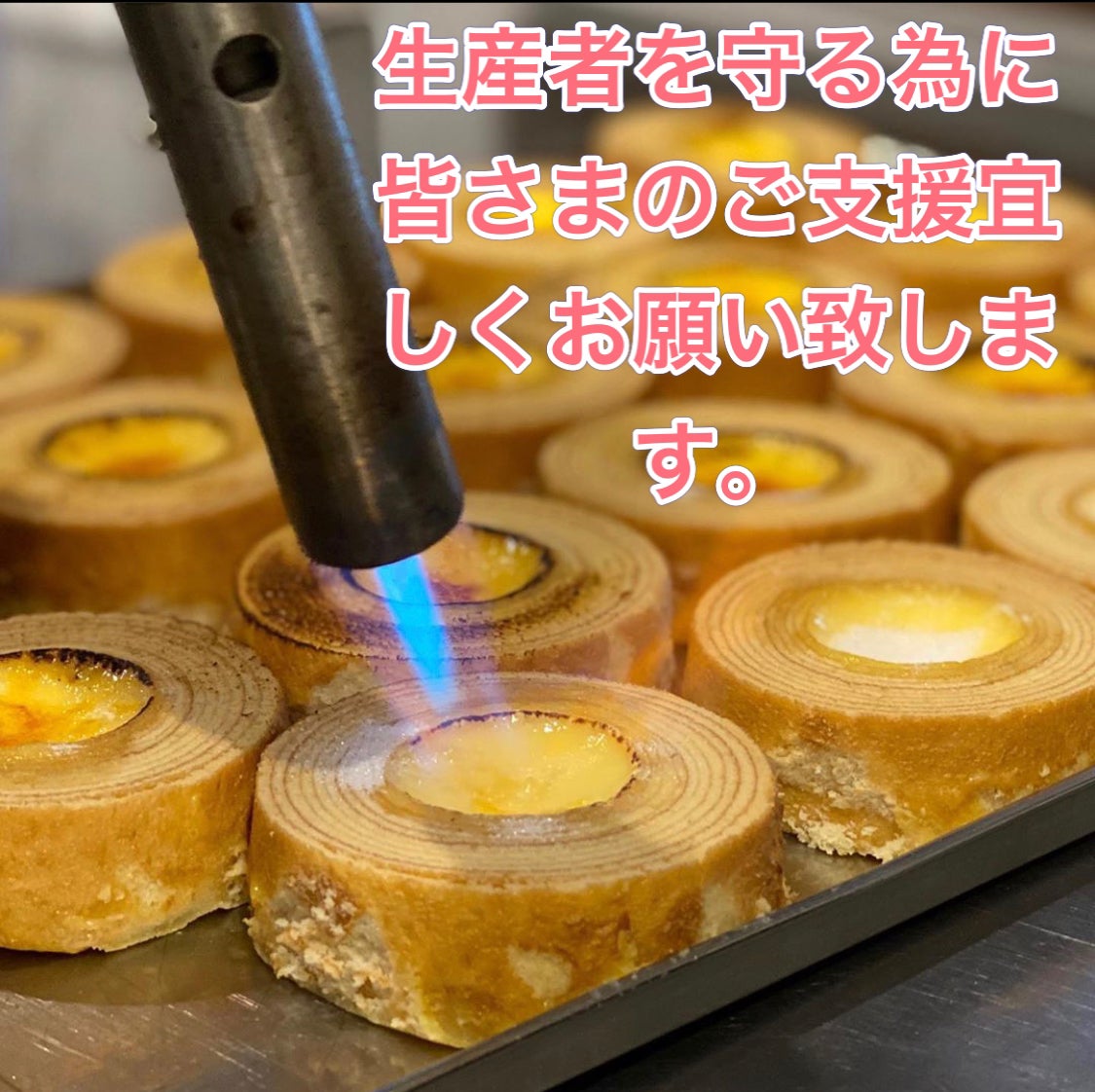 卵・牛乳は、毎日毎日産みだすものでストップを掛けれません。そんな卵・牛乳をたくさん使用しているのがバウムクーヘンです。少しでも加工品に変えることで生産者さんを支援、また店舗の経営・店舗スタッフの生活などを含むすべてのみなさんを守るため、皆様にお力をお借りし、コロナの危機を乗り越えたいと思っております。