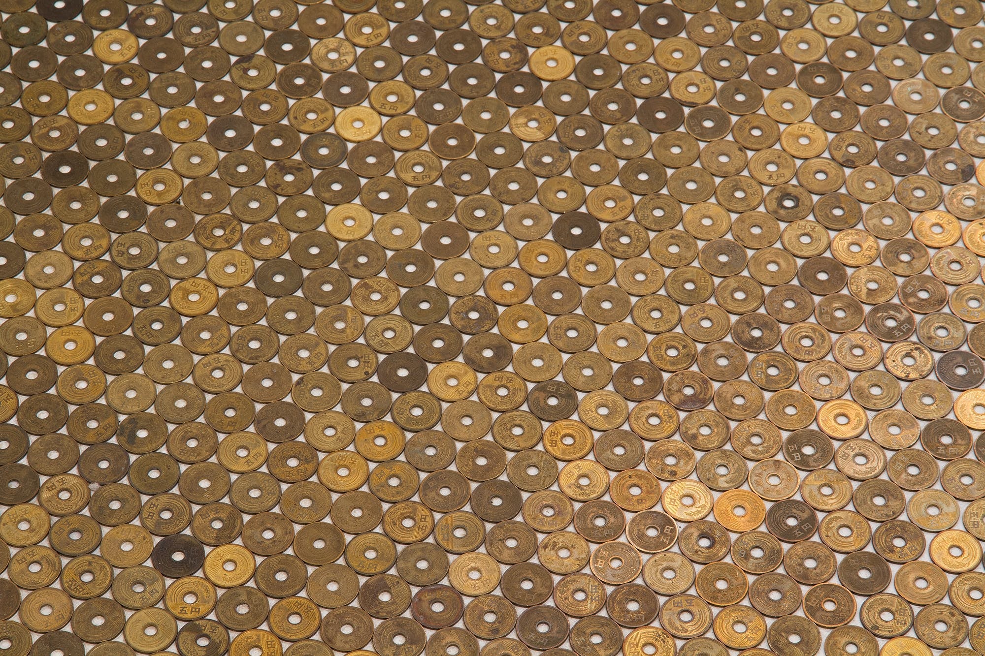 風間天心の個展「信仰」にて敷き詰められた五円玉