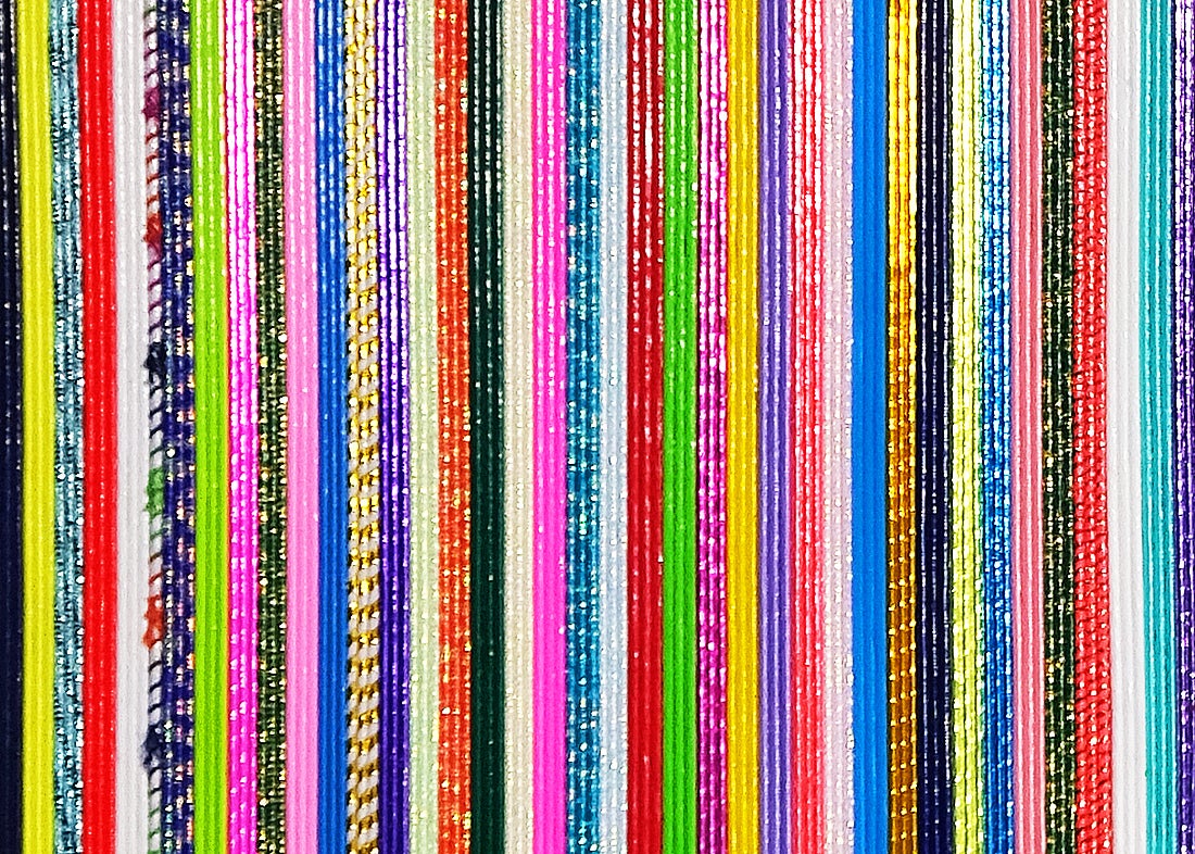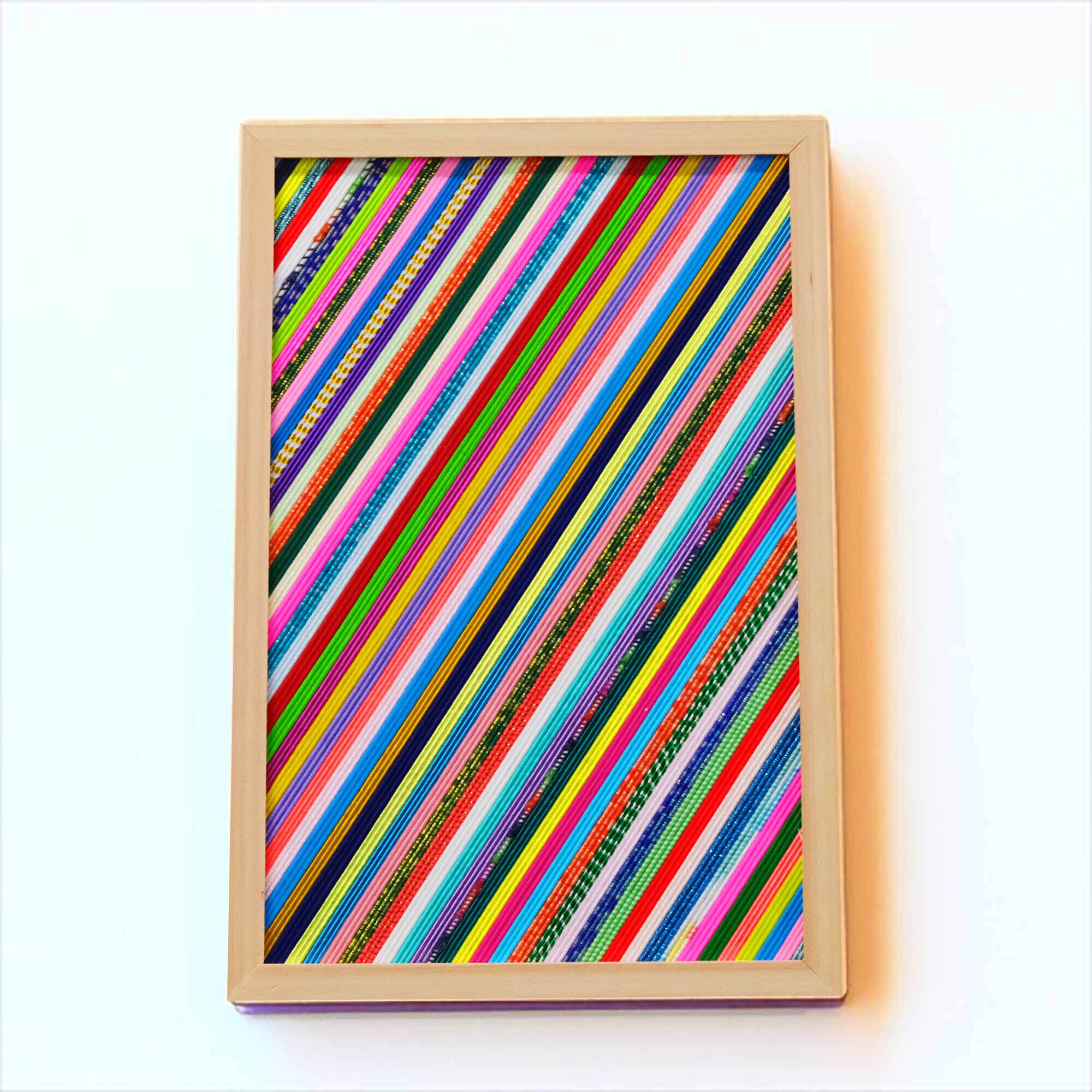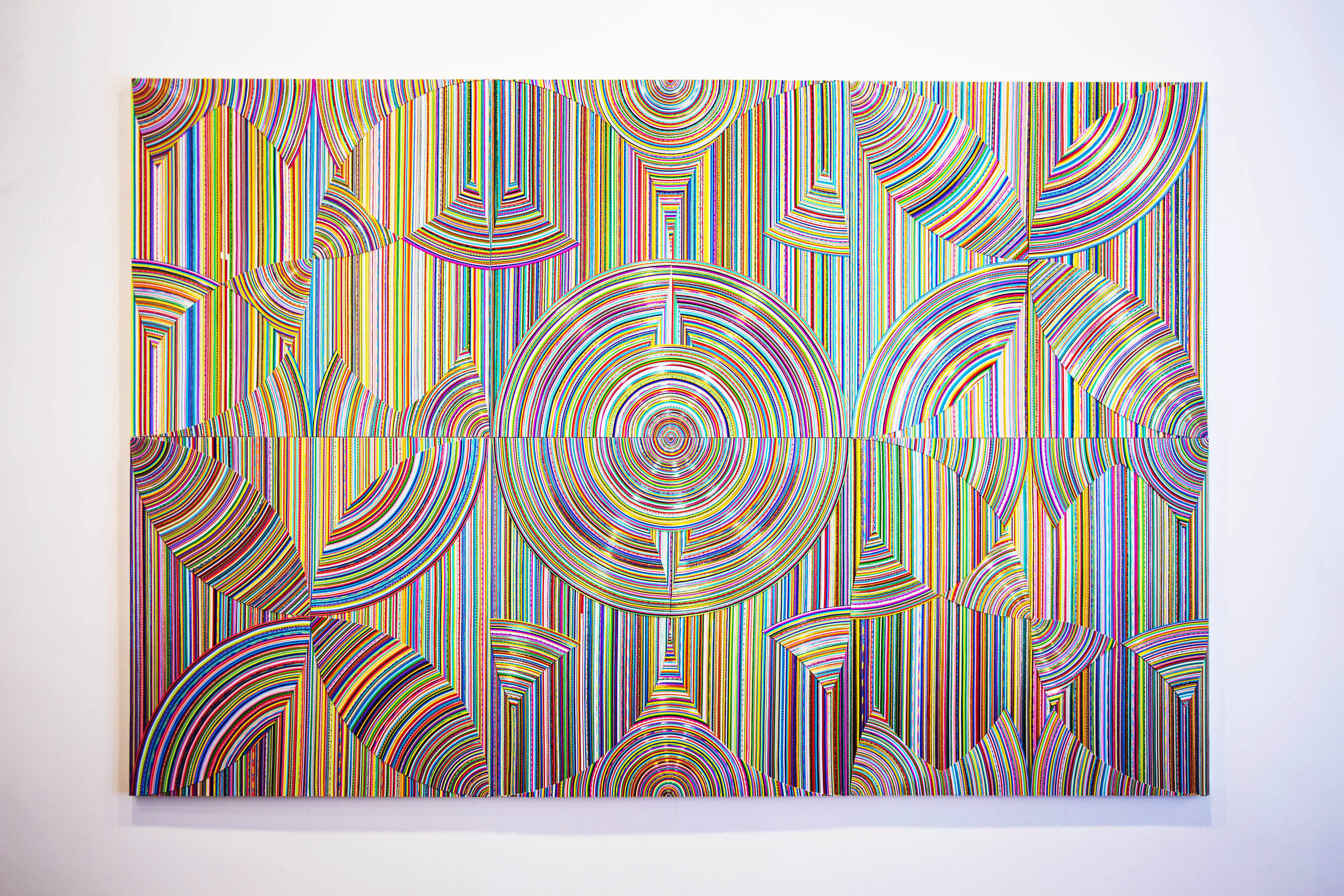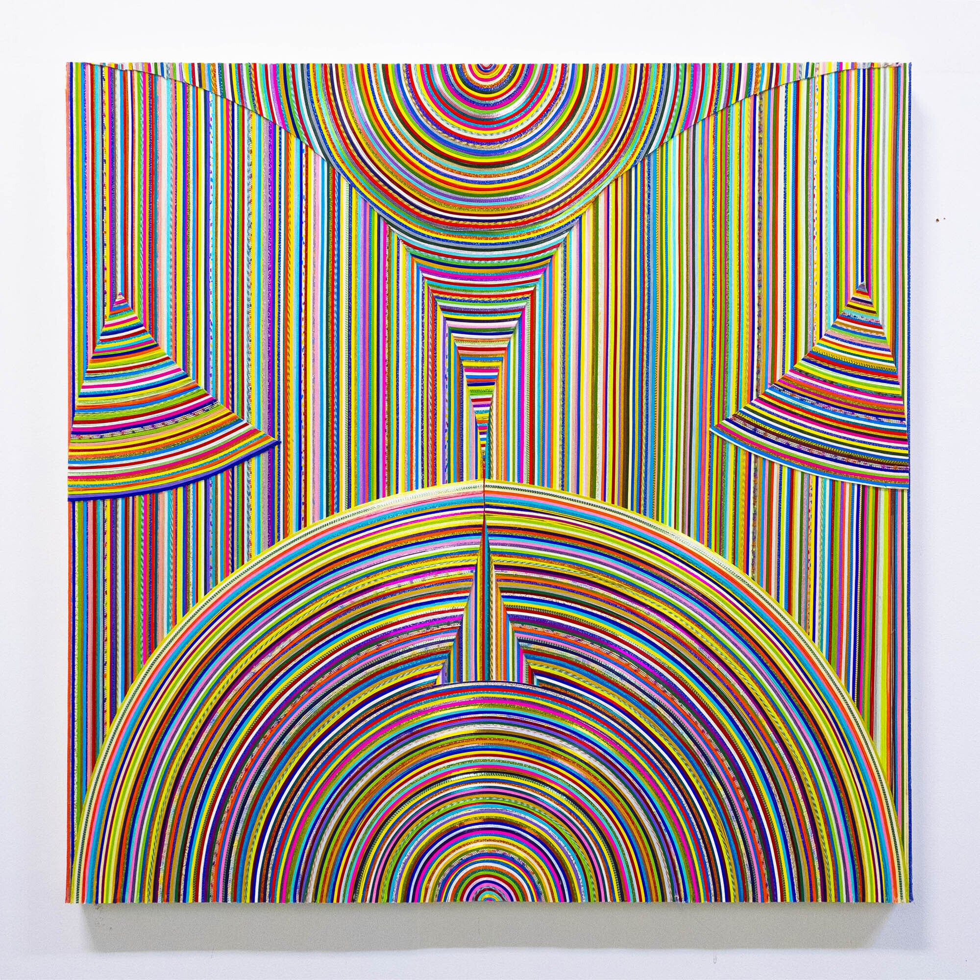 下記の作品は、風間天心が水引を用いて制作している平面作品「Ebb-Ripple-910R」になります。(作品サイズ:高さ91cm × 幅 91cm × 奥行3cm、素材:水引/木、制作年:2019年)