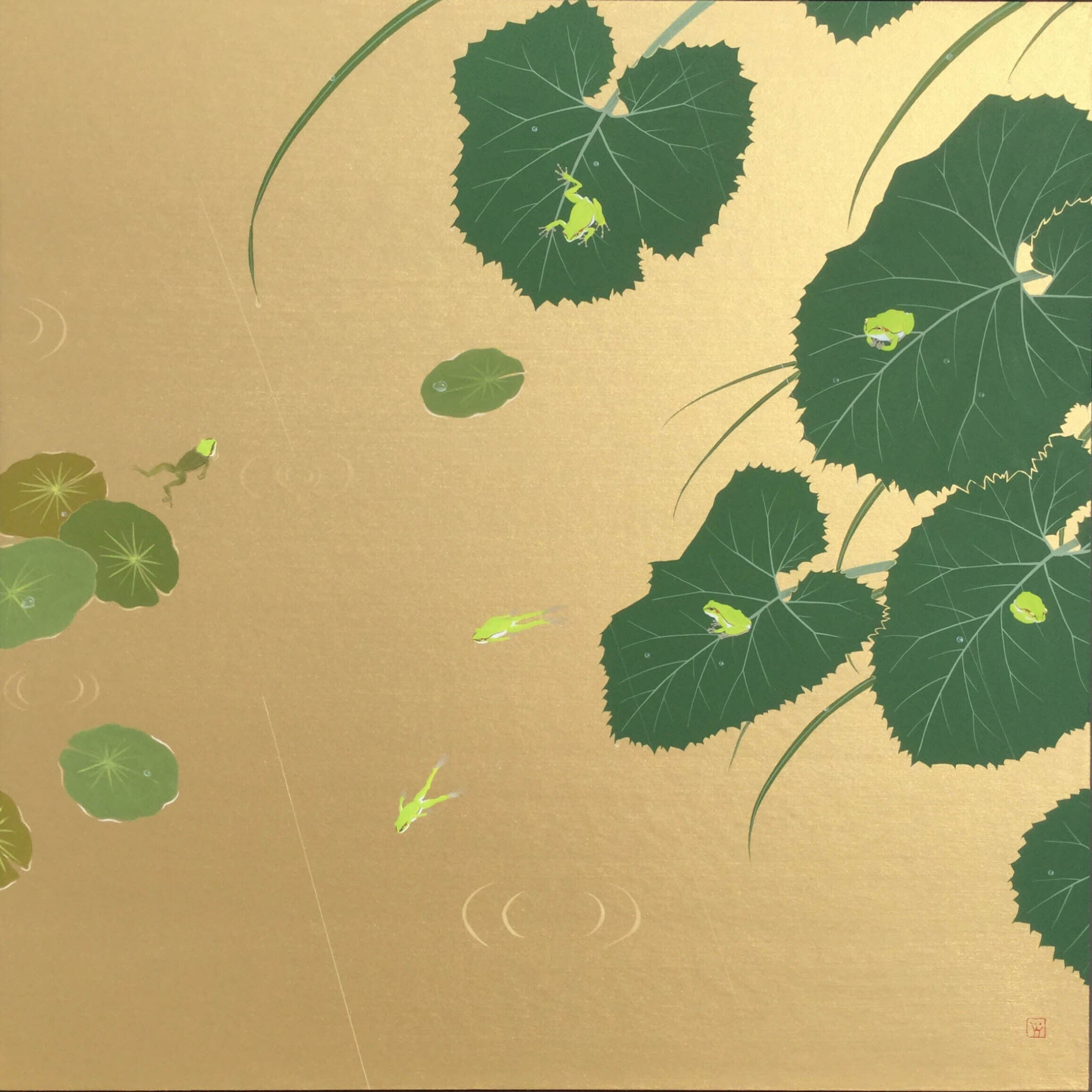 今回リターンとして出品している絵は、農村の田んぼに水を引くために作られた「ため池」に棲む「雨蛙(アマガエル)」の家族です。雨蛙を描く時、僕はどうしても擬人化をしてしまいます。「こんな所で楽しく生きてみたい。」「こんな平和な生活が戻って欲しい。」そんな願いを込めて制作しました。
