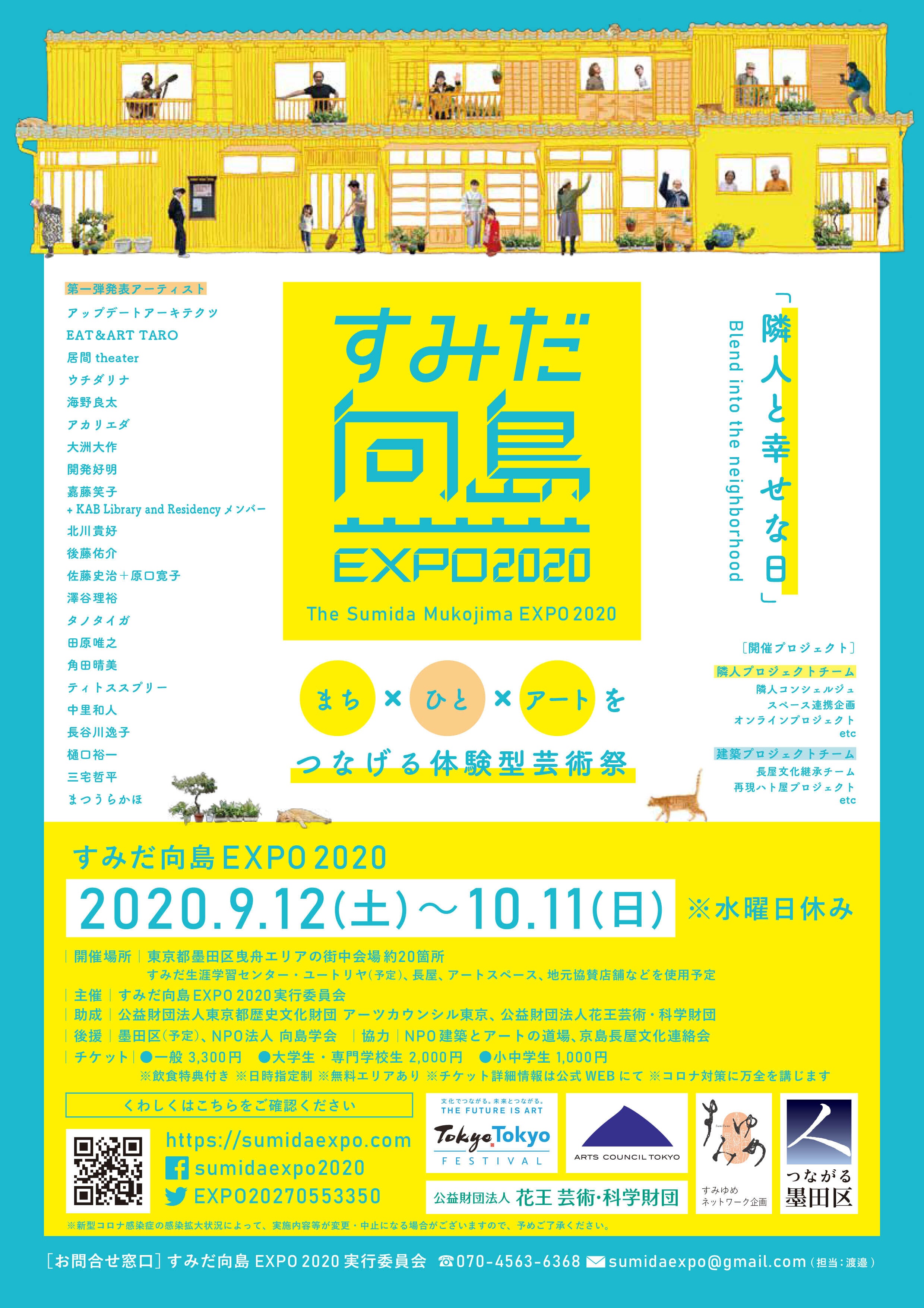 すみだ向島エリアにおいて「すみだ向島EXPO 2020」を開催します。「隣人と幸せな日」というテーマのもと、芸術と街のあたたかな結合を目指します。