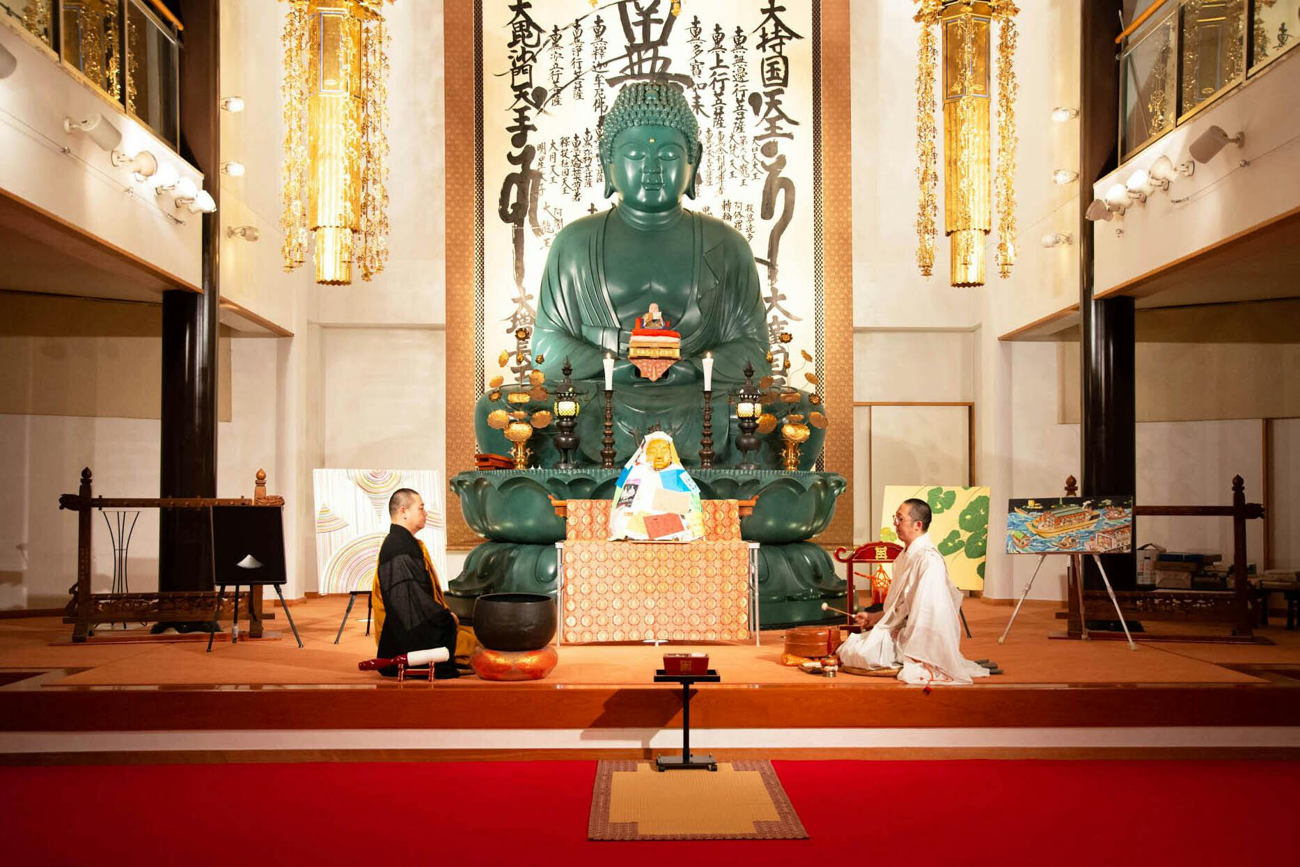 せっかくの大きな本堂と大仏をうまく活用する方法を考えた結果、本良さんと僕が向かい合うシンメトリーな形で法要を行うことにしました。キャラバンで訪れた会場は、ほとんどが初見の場所だったので、毎回その場でカメラや作品配置、イベントの段取りを決めていきます。