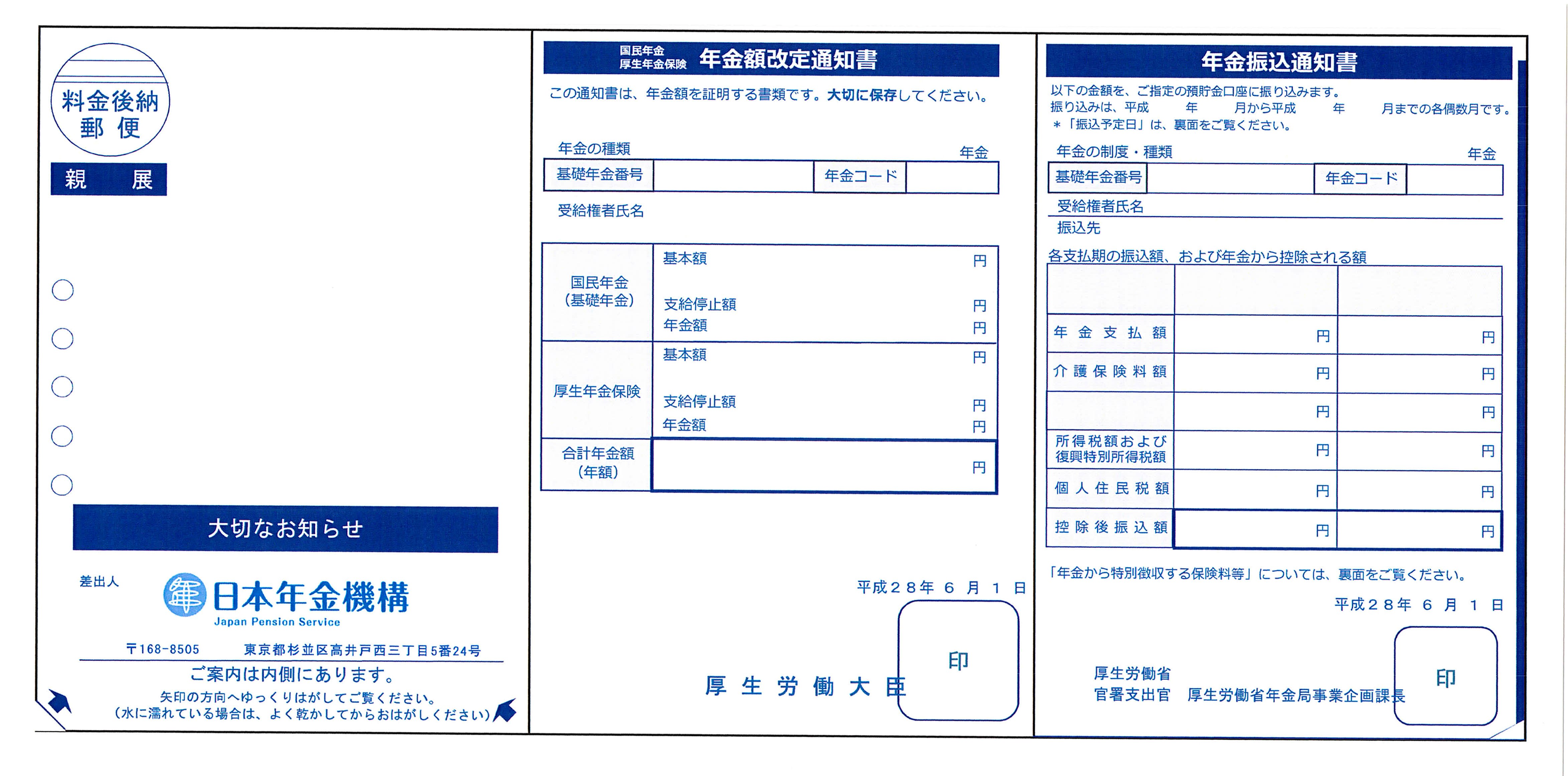 今年もこの通知が、6月に殆どの受給者宛に送付されます。年金額改定通知書と、振込通知書が一緒になった通知です。見ての通り真ん中が年金額改定通知書、右側が振込通知書となっています。