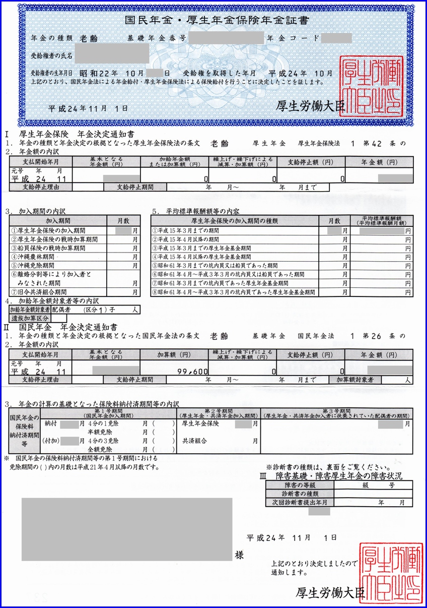 ここには掲載していませんが、この証書とは別に、「年金決定通知書・支給額変更通知書」が、送付されることがあります。証書の決定通知書の額からその後の変遷があった場合にその経過が記載されるものです。