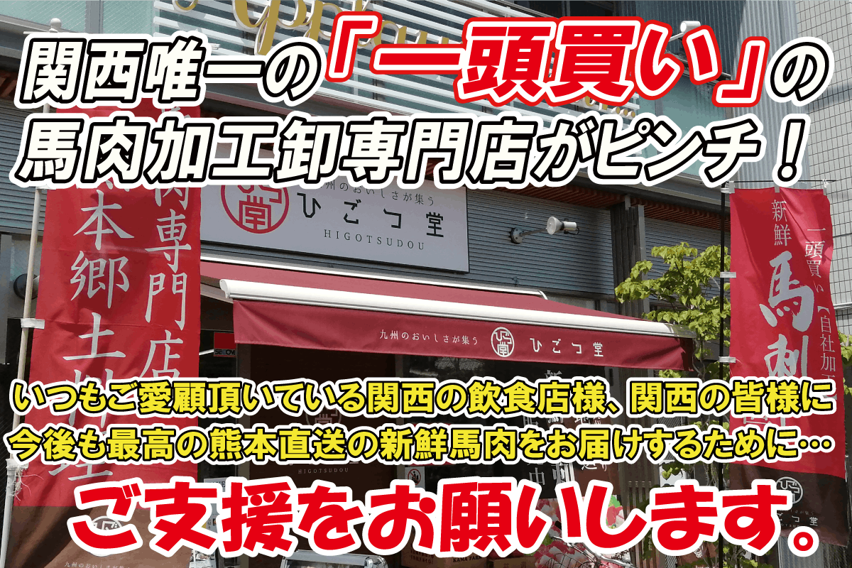 非常に珍しい熊本県産馬肉の業務用加工卸売専門店を、関西地方に存続していく為にも、多くの皆様からの温かいご支援のほど、心よりお待ちしております。