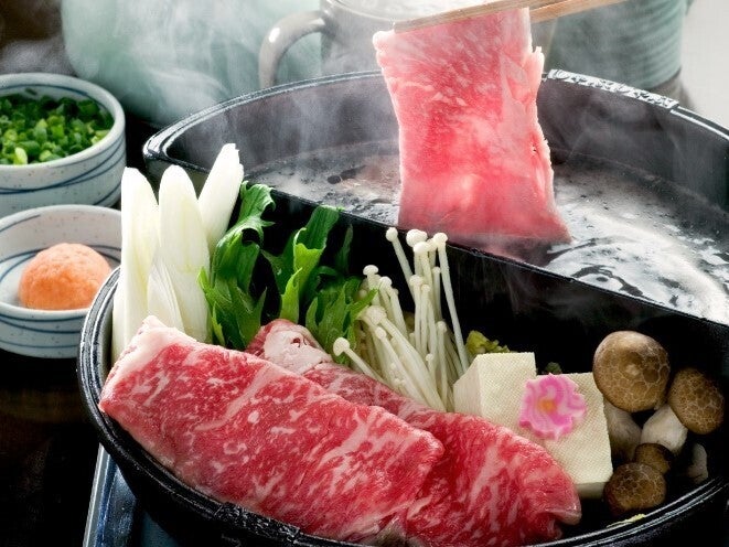 真ん中で区切られた特注のお鍋で、しゃぶしゃぶが食べたい方、すきやきが食べたい方、どちらの方にもご満足が頂けるようご提供させていただいております。