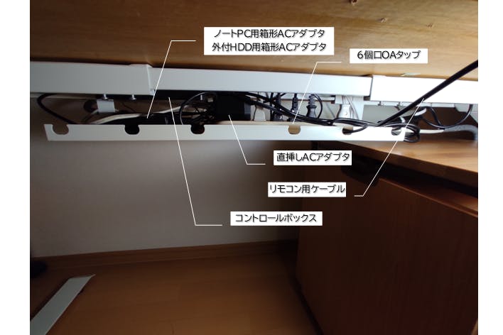 ケーブルトレイ付きのリターンをご検討くださる方へ、ケーブルトレイのサイズ感をお伝えしたく、サンプル品を自宅に設置しておりますので写真を追加掲載いたします。ノートPC用の箱形ACアダプタ、外付けHDD用の箱形 ACアダプタ、6個口のOAタップを載せられて、コード類は余った部分に納めることができています。OAタップから上向きにコンセントプラグが出てもコードと天板には1cm程度の余裕があります。背の低いACアダプタであればOAタップ直挿しタイプでも大丈夫です。トレイのサイズは約 60cm×約12cmです。トレイから天板までの隙間は約11cmです。(コントロールボックスを写真の位置に設置した場合、コントロールボックスからトレイまでの隙間は約6cmとなります)※コントロールボックスは写真の位置でフレームに引っかけることもできますし、天板の任意の位置にネジ固定することも可能です。