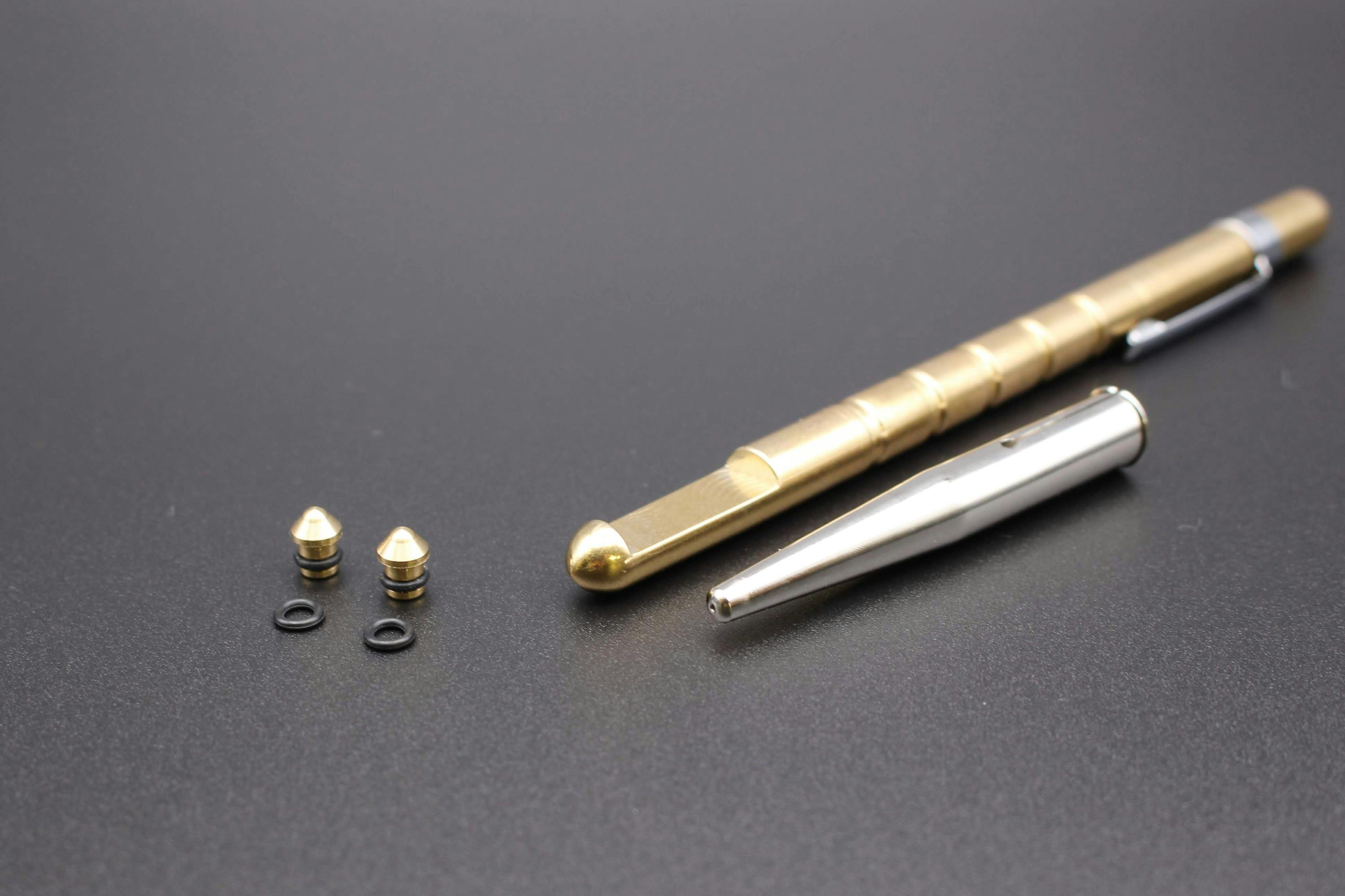 多機能ペン(三菱鉛筆㈱製 uni JETSTREAM)の消しゴム部分を我々が作成した真鍮製の「タッチレスヘッド」に交換し、この部分で接触が不安なボタンなどに触れてください。銅には銅イオンによる殺菌作用(微量金属作用 ) があり、銅合金である真鍮にも同様の効果があります。