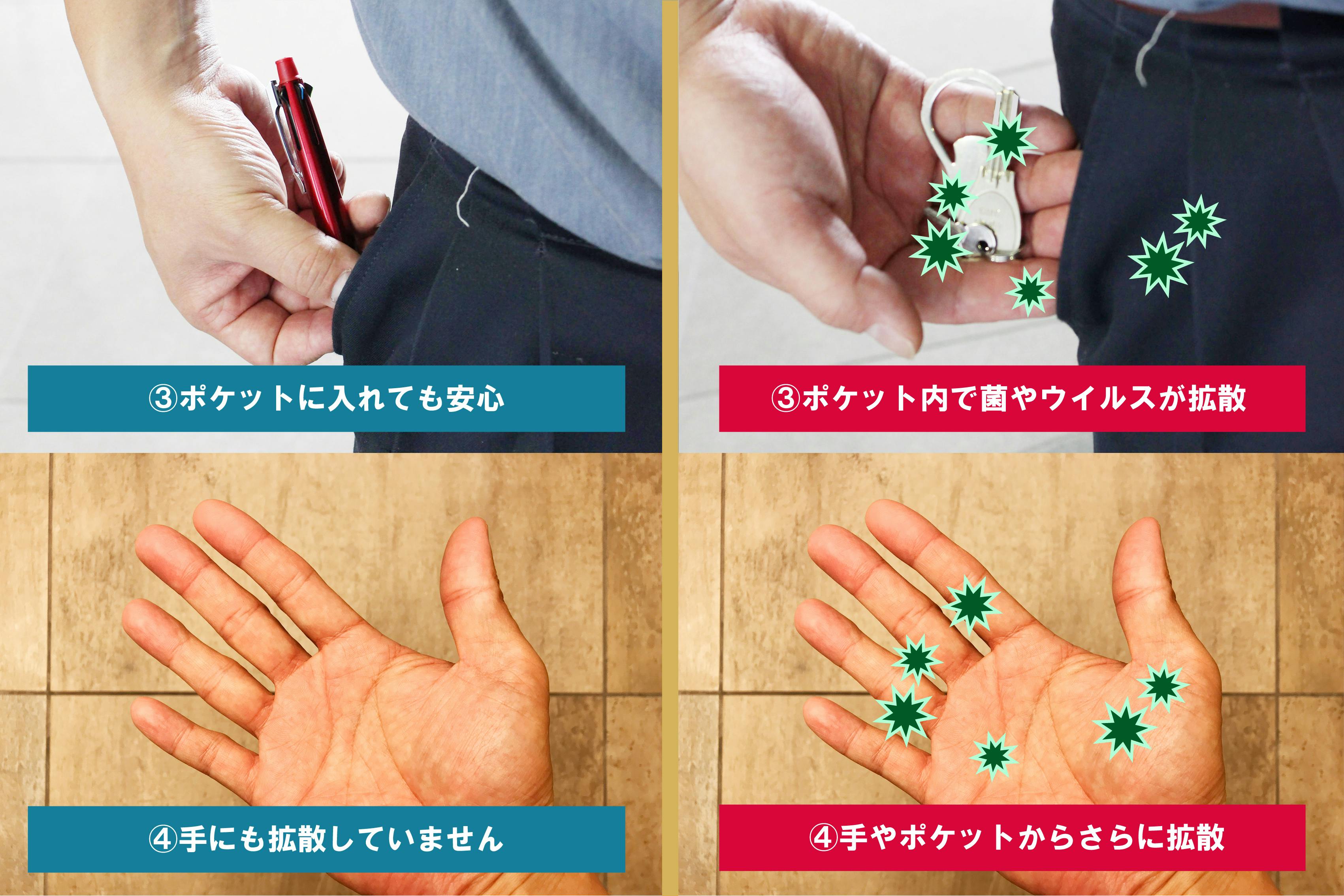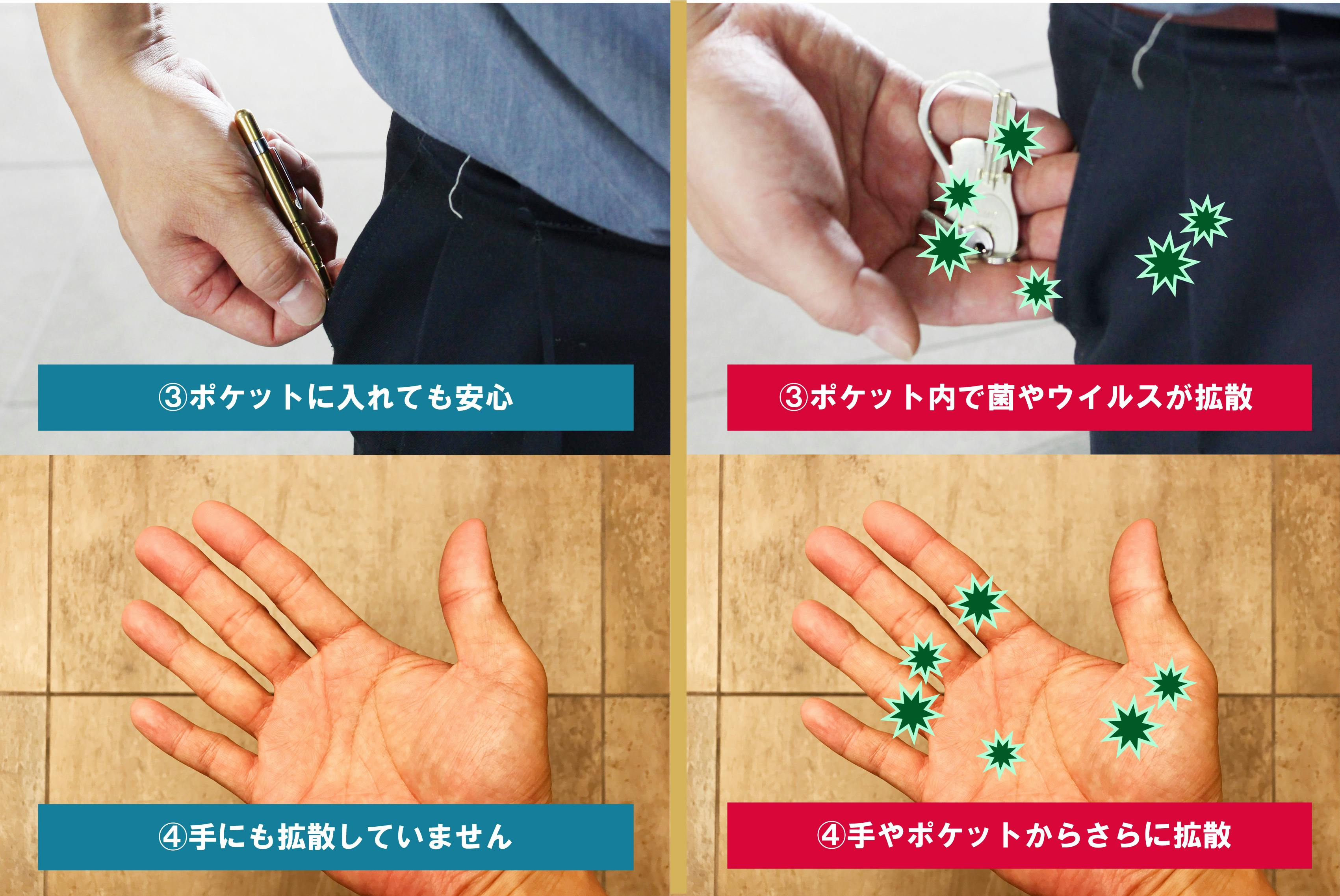これでは、いくら抗菌、殺菌作用を持つ素材でできていたとしても、そのツールについている菌を手で触ってしまっては、感染、拡散の危険性が高いことになります。