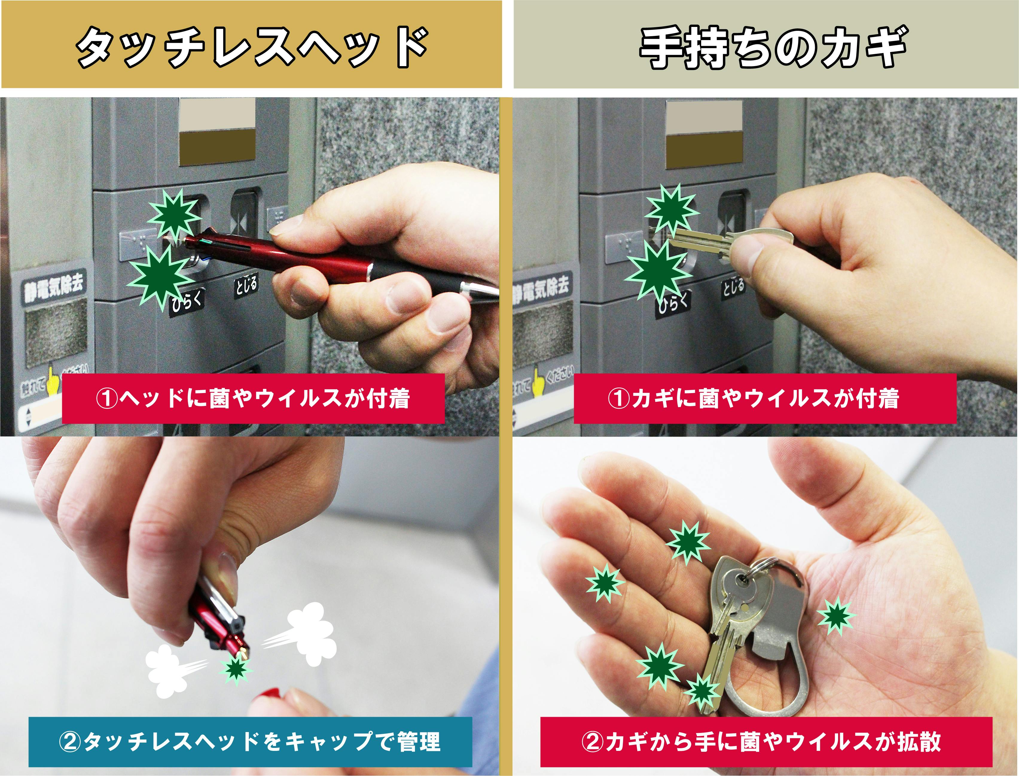 「タッチレスヘッド」は胸ポケットやカバンからスッと取り出して使えるので、さりげなくごく自然にボタンを押すことのできるツールです。