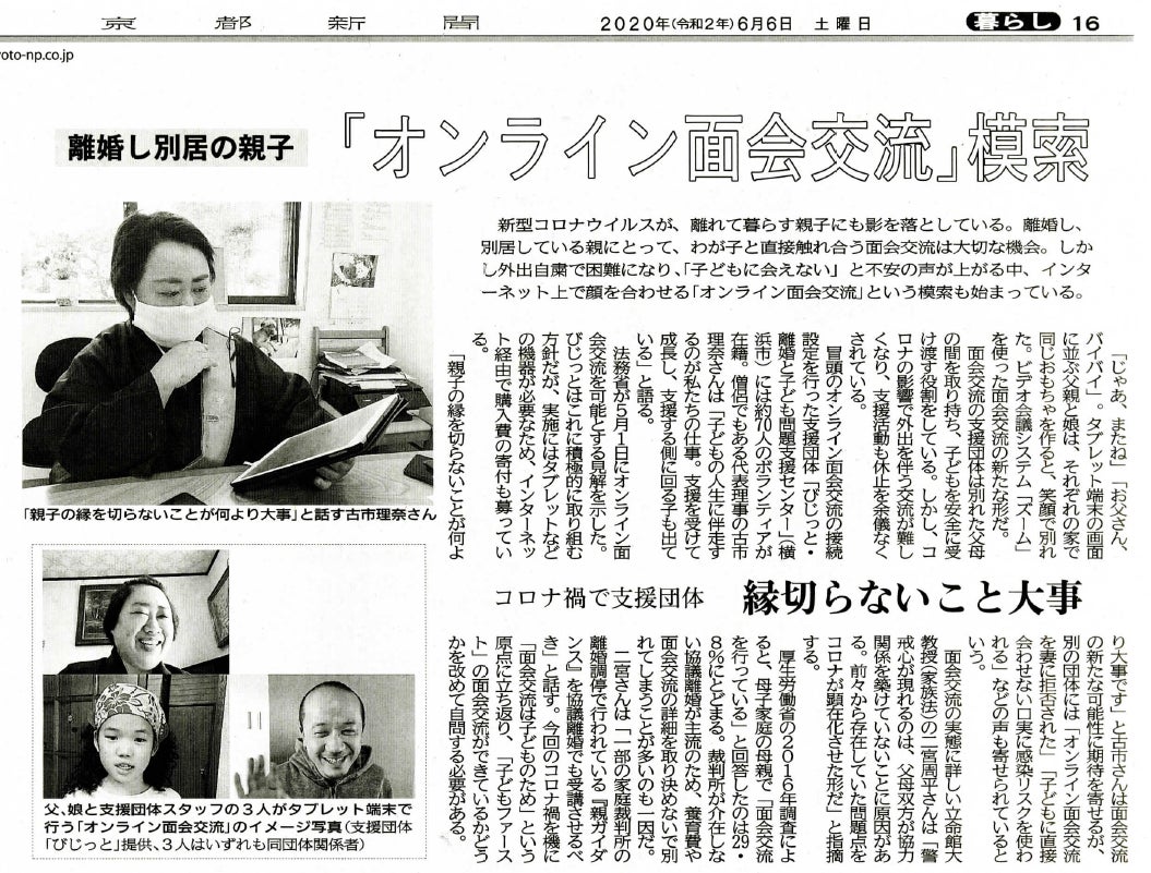 先週末から、京都新聞、陸奥新聞、河北新報等の新聞各紙がオンライン面会交流の問題を取り上げてくださっています。京都新聞さまの許可を得て、紙面を支援者の皆様に共有させていただきます。