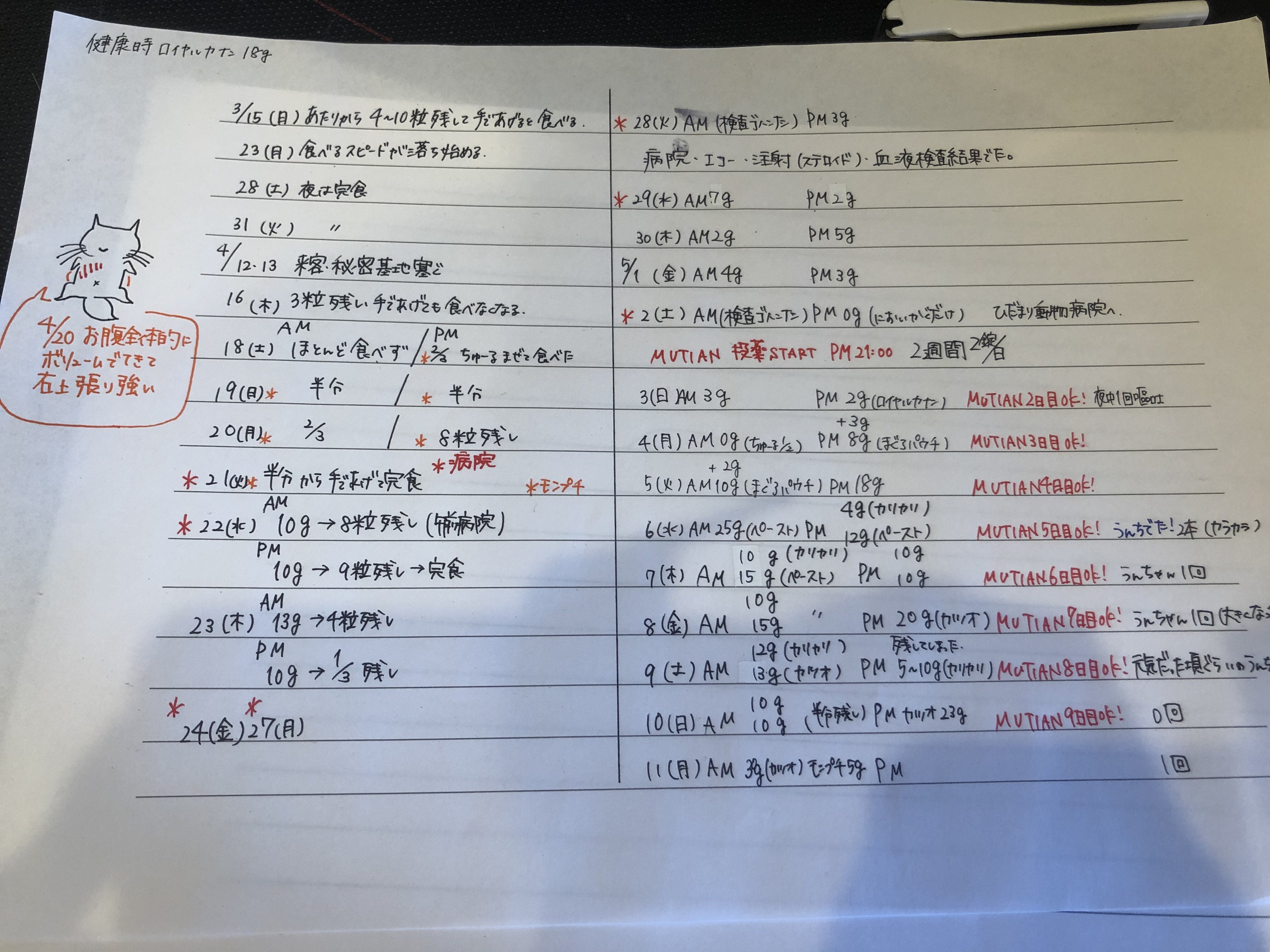 3/15あたりからご飯を少しづつ残すようになり、新型コロナの影響で飼い主が家にいることも増えたために初めはストレスで食欲不振なのかと思い様子を見ていました。