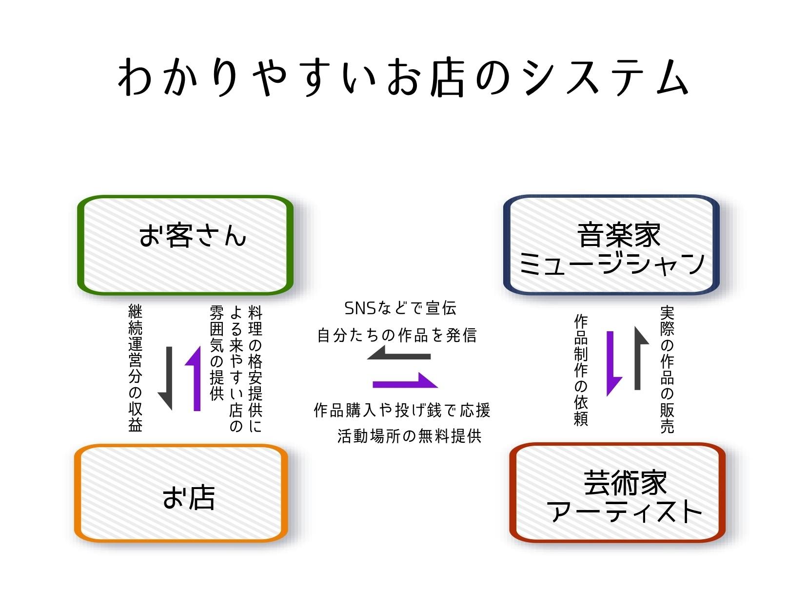 ですので、作品販売における手数料は一切不要です。そして、やってみたいことや提案があれば、相談に乗り、実現のバックアップをしていきます。また、多様なジャンルの芸術が行き交うコミュニティを作ることによって、それぞれ足りなかった要素を補い合い、お互いができることを探し、作品の質を高め合い、金銭のやり取りが行われる場所にします。