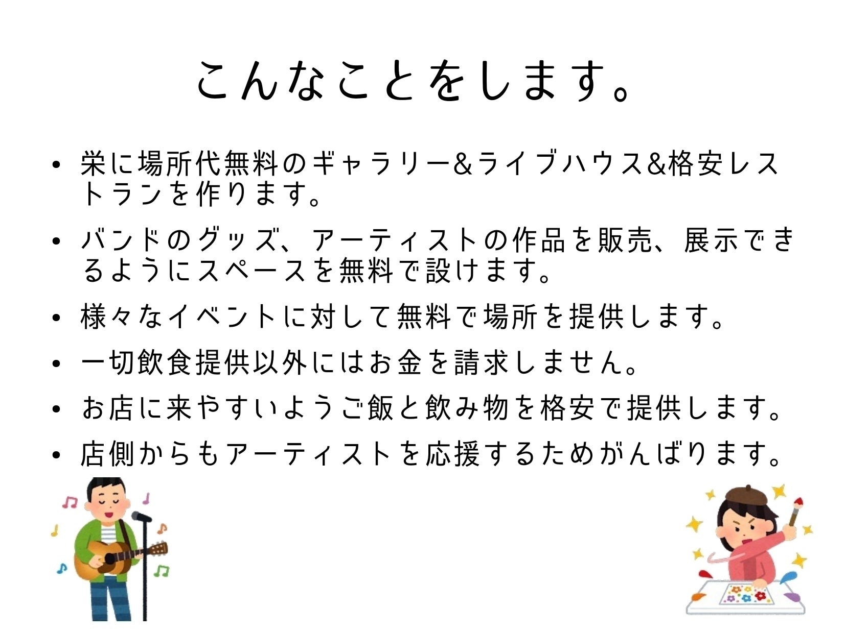 ですので、作品販売における手数料は一切不要です。そして、やってみたいことや提案があれば、相談に乗り、実現のバックアップをしていきます。また、多様なジャンルの芸術が行き交うコミュニティを作ることによって、それぞれ足りなかった要素を補い合い、お互いができることを探し、作品の質を高め合い、金銭のやり取りが行われる場所にします。
