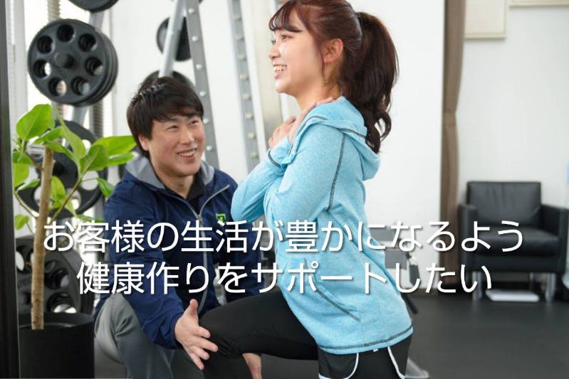 をテーマとし、お客様一人ひとりのゴールに合わせたトレーニング内容のご提案に加え、食事指導や自宅でのトレーニングの提案も行い、目標達成後もトレーニングを続けてもらえる環境づくりをしています。また、看護師資格を持つスタッフによるカウンセリングを通し、安心・安全にトレーニングを受けていただける環境を提供をしております。