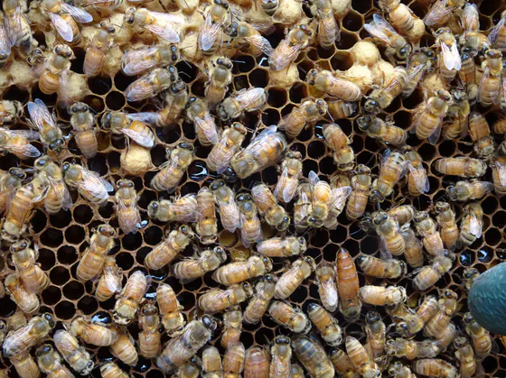 右下の青い指の示す先に少し腹が働き蜂よりも長い女王がいます。