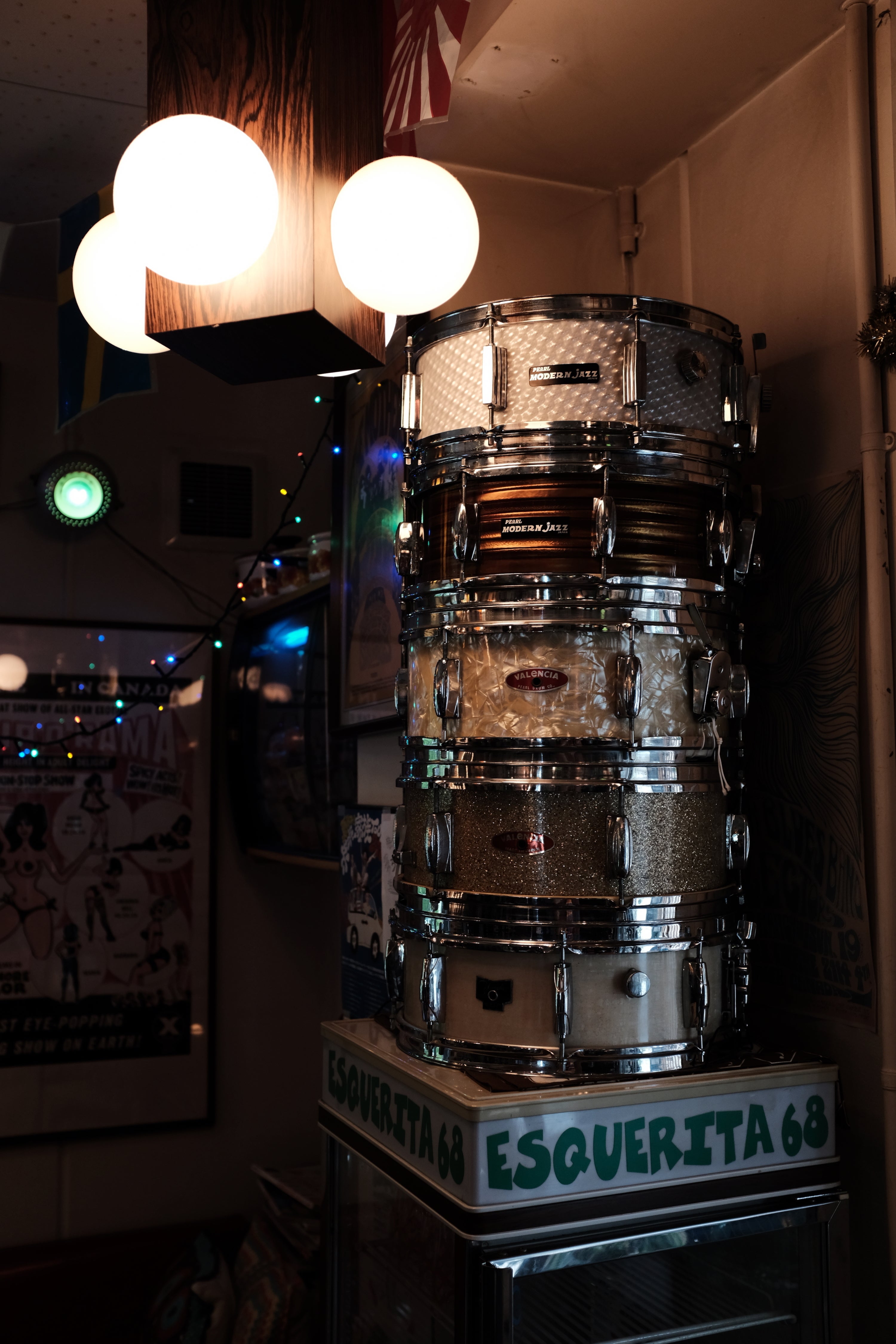 店内に常設している球体スピーカーが音作りの中心となり、日本のヴィンテージアンプやヴィンテージドラム、ギターなどを徐々に揃え、現在のかたちに。特に自身でも演奏するためヴィンテージドラムにはまり、中古の楽器を見つけてきては集めることにのめり込みました。