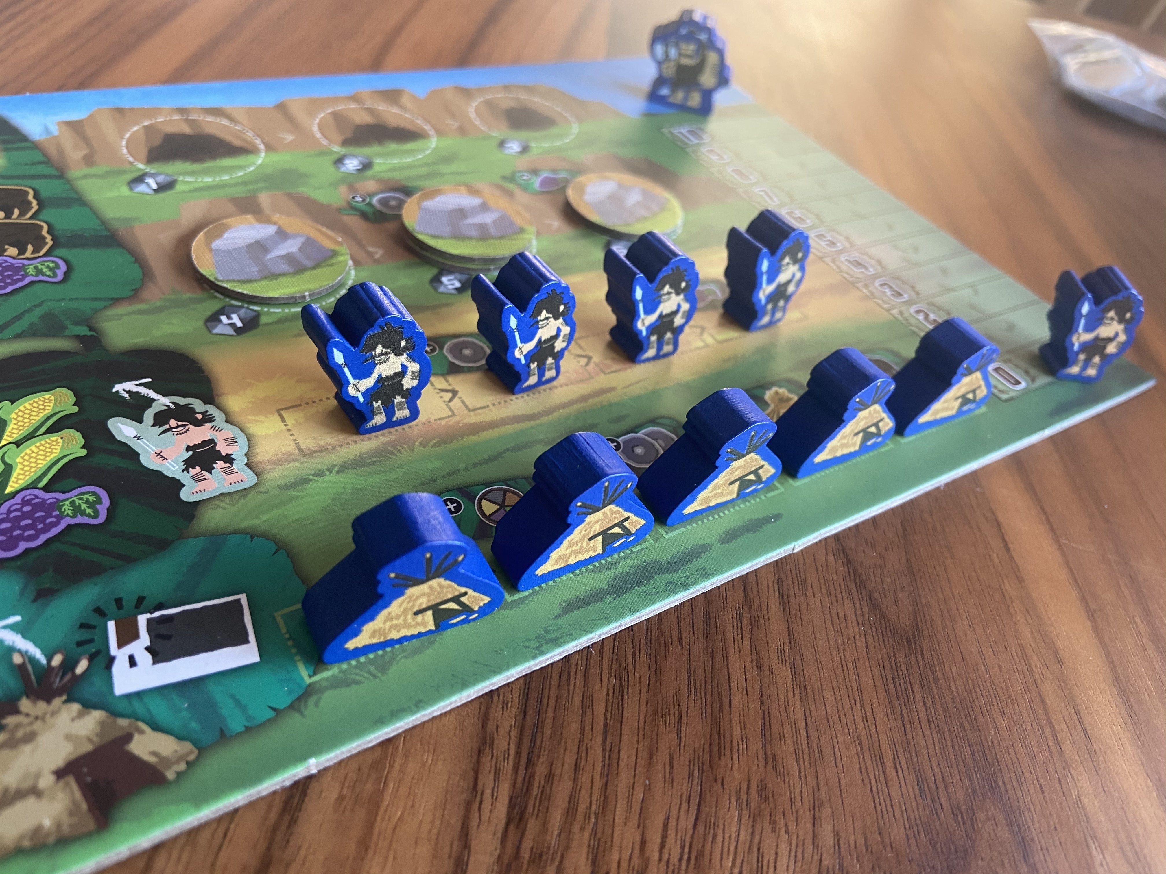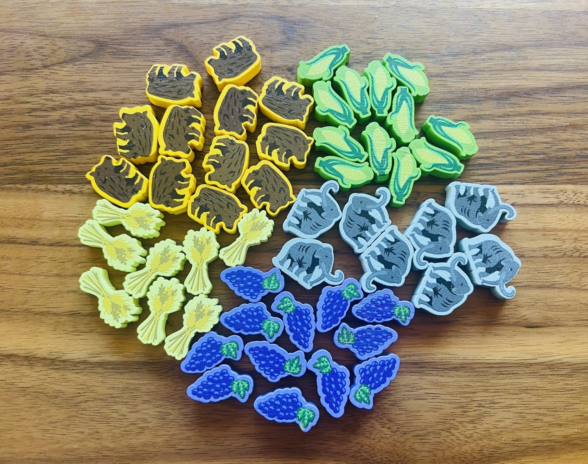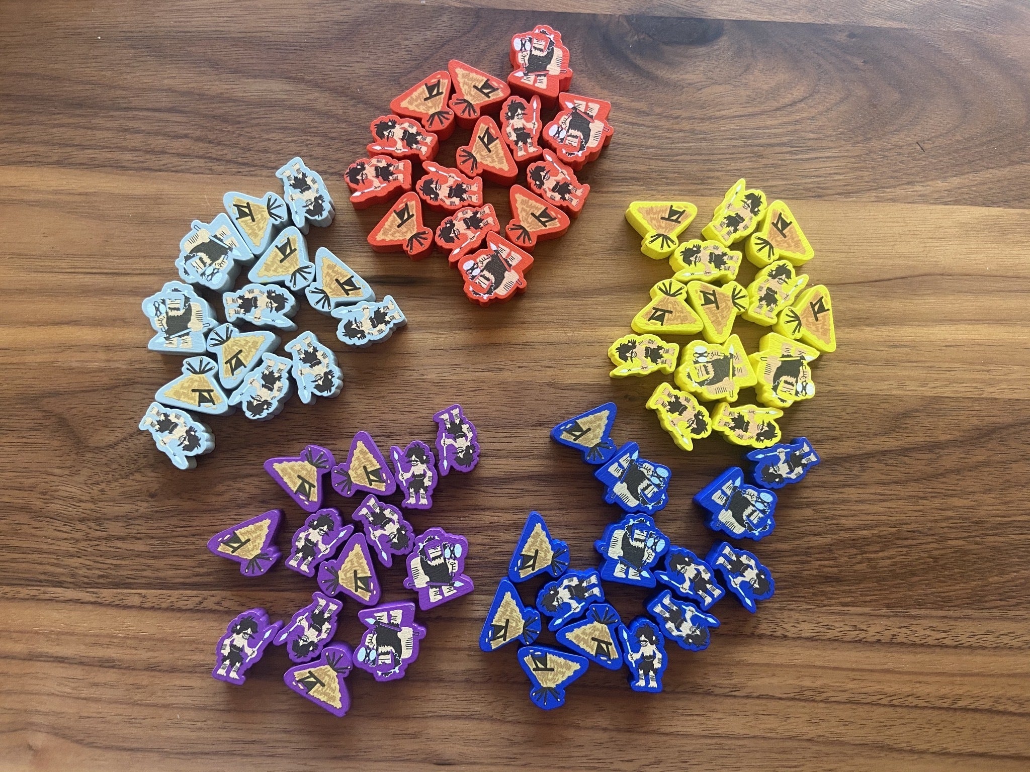 67コマのプレイヤー駒は、全て表裏印刷となっております。(赤と青の族長駒のみ、2人プレイ用で一つづつ多く入っています。)